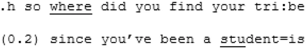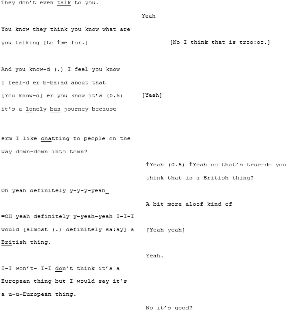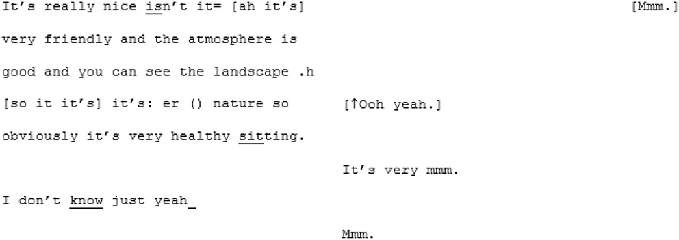 These two speakers appear to be closely attuned. Their monologic turns do not disrupt the flow, perhaps because of the adjacency: both speakers are inclined to take them. The conversation has its own rhythm, its own flow and a sense of symmetry. Progressivity, here, is not rushed; each speaker allows the other to go on whilst maintaining the thread. There is a feeling of natural, structural coordination which may supports the building of “we-ness.”