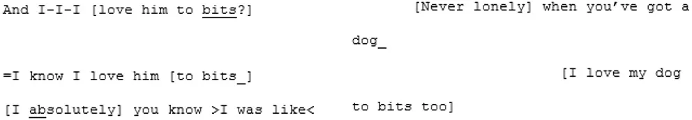 The shared enthusiasm crescendos around lines 52–101, where they discover they both have dogs. A1's dog is clearly a significant and supportive character in A1's life: he is mentioned in all three of his recorded conversations and also during informal discussions in the waiting room. In this matched-dispositional conversation, mention of the dog appears to spark a long sequence full of laughter, emphatic agreement (e.g., “Me too”- line 56; “YEAH tha-tha-that's why that's exactly what I do”—lines 69–70), shared parallel anecdotes and echoic mirroring of the phrase “love… to bits:”