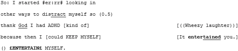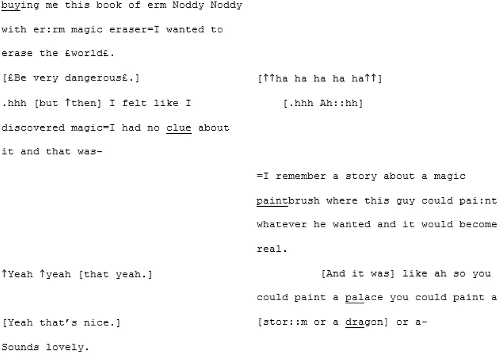 Directly following the extract above, A3 completes her turn by explaining that her coping method, as a young child, was to turn to books. A4 responds by offering his own parallel anecdote, telling A3 how he also read a lot as a child, and used it as a way to access fantasy worlds: “faraway lands and magic and stuff that was all miles and miles away from what was a very isolated childhood I think” (lines 206–209). For someone who has repeatedly expressed uncertainty around the concept of loneliness and what it means for him, this seems an insightful moment. It spurs A3 to share a memory of a book that was special to her, which triggers a creative, playful, exuberant sequence: