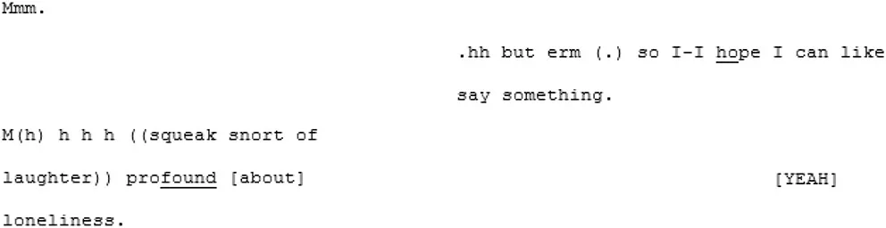 The most striking feature of this conversation, however, and most indicative that these speakers are tuning-in, is the immediate and enduring presence of humor and shared laughter, demonstrated in the final extract above. The humor appears to expands a sense of “solidarity” and rapport in which a deeply personal exchange was able to take place (both participants also shared how moving and surprising they had found the experience shortly after recording).