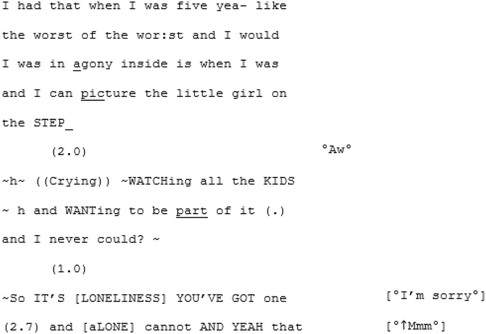 While A3 finishes her story over the following 10 lines, A4 quietly listens. There is no awkwardness, no attempt to interrupt or disrupt the flow with deflective humor and no stilted pauses when she has finished. Historically, this kind of muted response might have been interpreted as evidence of an autistic lack of interest in the feelings of others. Yet we suggest that this moment does not represent an absence of affective empathy. It is a moment of deep listening: of “daring to go on” (Sterponi and Fasulo, 2010) with A3 and her intimate sharing.