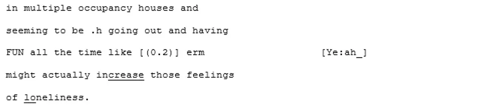 Despite the length of each speaker's sequences, the other remains engaged throughout with a sense of rapport, demonstrated by lots of backchannelling, and mutual, enthusiastic agreement. During a passage where X3 is describing how she has found the city much easier to navigate during moments when traffic has been stopped, there is a moment of mirroring of the word “kindness.”