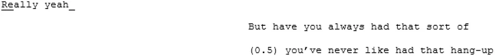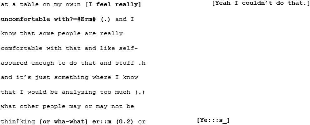 In the cross-dispositional conversation between A2 and her familiar interlocutor, X2, there appears to be a greater sense of balance in terms of turn-taking and contributions, but the turns are still often very long (one turn, for example, lasts 45 lines/1 min and 22 s). Again, there are a lot of pauses and gaps, particularly in the first few minutes, and episodes of parallel dialogues where both acknowledge the other's contributions but continue with their own separate topic when the turn passes back to them. Despite A2 introducing X2 as her friend, and them appearing to have a good understanding of each other's day-to-day, the dialogue comes across as rather staid. The conversation remains on a theoretical, intellectual level about the nature and causes of loneliness with not one moment of laughter, enthusiasm, or signal of affect throughout.