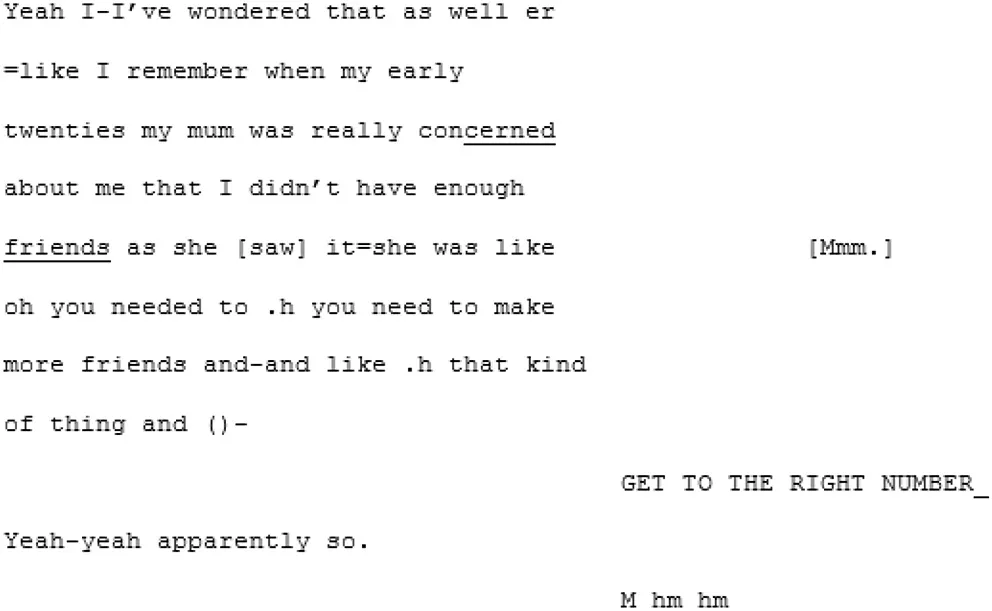 Following this deflective response, B3 ends her attempt to talk about the loneliness she had recently experienced and A4 takes the floor and, whether intentionally or not, this turn acts to maneuver the conversation away from potentially emotive content to a shallower sequence about loneliness facts and statistics.