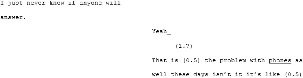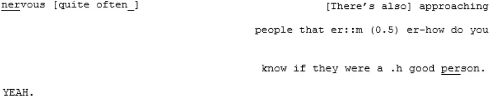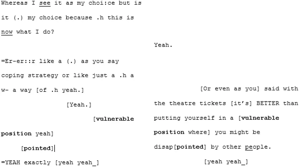 Conversations were digitally recorded and professionally transcribed according to the transcription conventions adopted for use in Conversation Analysis (originally developed by Jefferson, 1984, see Supplementary Material) to include information pertaining to pauses, word stress, and intonation etc., whilst remaining readable.