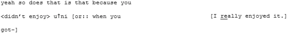 These features all combine to stall the flow of A6's speech and the pace of the exchange. Where A6 interjects with supportive or enthusiastic backchannelling when her friend (X6) is speaking, X6 tends to sit back when A6 is engaged in formulating a long, sometimes meandering turn. On first glance this may seem like disengagement, but this conversation also seems to feature some moments of affective coordination in the form of shared laughter and cooperative sequences where both parties' turns build toward a shared perspective.