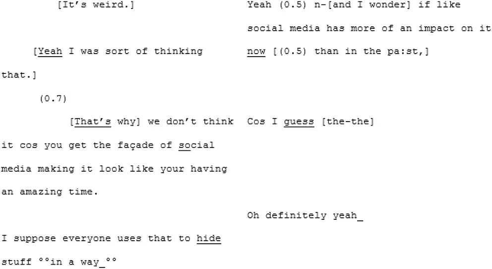 The tuning-in motif brings together characteristics of the conversational form and non-propositional content that indicate that interlocutors are “on the same wavelength” (Koudenburg et al., 2017, p. 53). Features of coordination, such as mirroring the other's speech (either by echoing specific words or phrases or offering parallel anecdotes), and finishing the other's sentences combine with evidence of rapport and the presence of shared jokes and humor (a form of affective coordination: Nelson et al., 2016) to create a sense of dyadic synchrony, or “closely aligned intersubjectivity” (Heasman and Gillespie, 2019, p. 916) that Koudenburg et al. (2017) have termed “emergent we-ness” or “solidarity.”