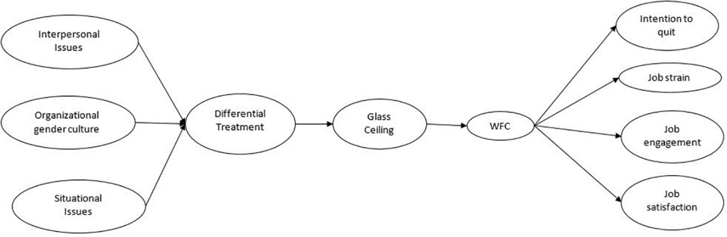 Although there are many articles on the glass ceiling, very few, to our knowledge, and investigate its effects on workers. That is the reason why one of the objectives of our study is to extend the understanding of this phenomenon by also investigating its consequences for organizational attitudes and women managers’ well-being. Better assessing the consequences of the glass ceiling seems essential to sensitize companies to this issue. Through our study, we want to investigate the links between the perception of the glass ceiling and five concepts, i.e., WFC, job strain, intention to quit, job engagement, and job satisfaction. Specifically, we intend to investigate the mediating role of WFC in the relationship between the glass ceiling and the other four outcomes. We have included job strain and intention to quit in this study because they are the strongest outcomes related to WFC among work-related outcomes (Allen et al., 2000; Amstad et al., 2011), and job satisfaction because it is the work-related outcome that has attracted the most research attention (Allen et al., 2000; Amstad et al., 2011). Considering that little is known about the effects of WFC on positive indicators of well-being (Peeters et al., 2013), we have considered job engagement in relation with WFC because this concept is a well-known indicator of well-being (Bakker and Demerouti, 2008, 2017).