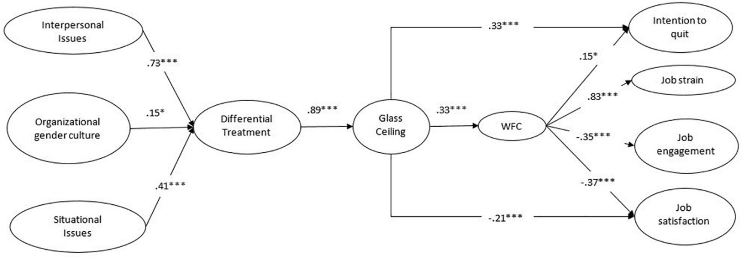 Therefore, based on the above, we postulate that the perception of a glass ceiling will increase the perception of WFC, which, in turn, will increase job strain and intention to quit, and decrease job engagement and job satisfaction: