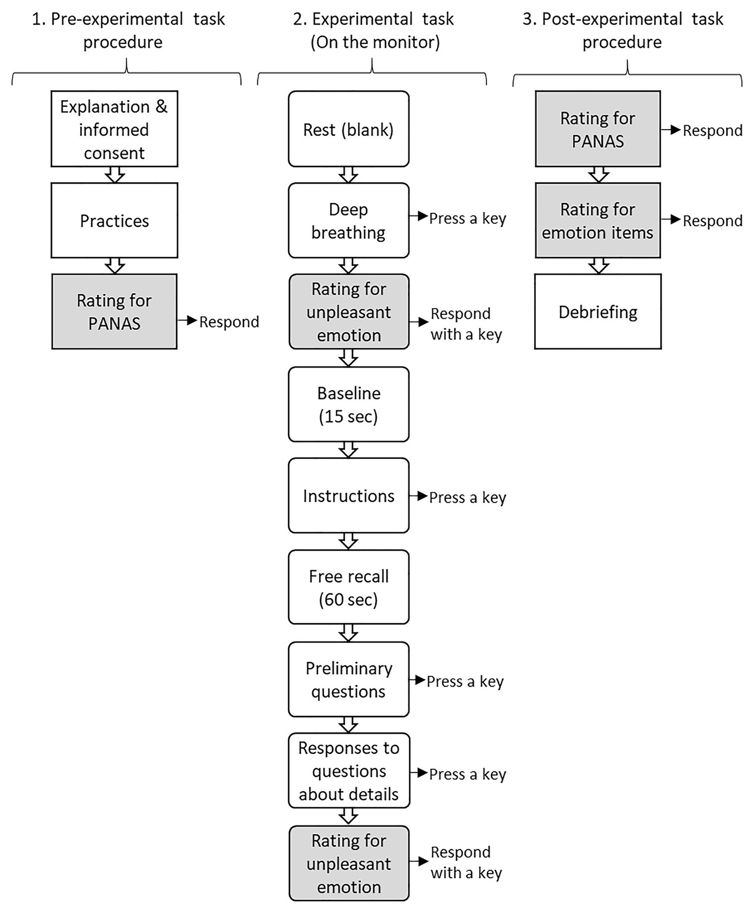 The experimental task was conducted in a shielded room with dim lighting. Initially, an experimenter instructed participants to conduct a few practice sessions to confirm the experimental task procedure. They were informed that a series of instructions or questions written in white letters would be displayed on the black background of a monitor in the experimental task. Each monitor was offset by the participant’s key press, at their own pace (except baseline and free recall that were set at 15 and 60 s, respectively). Participants were instructed to proceed to the next screen by a key press after fully understanding the previous instructions or adequately responding the relevant questions in their minds. Subsequently, participants completed the PANAS, which measured their emotional state at the time of the experiment.