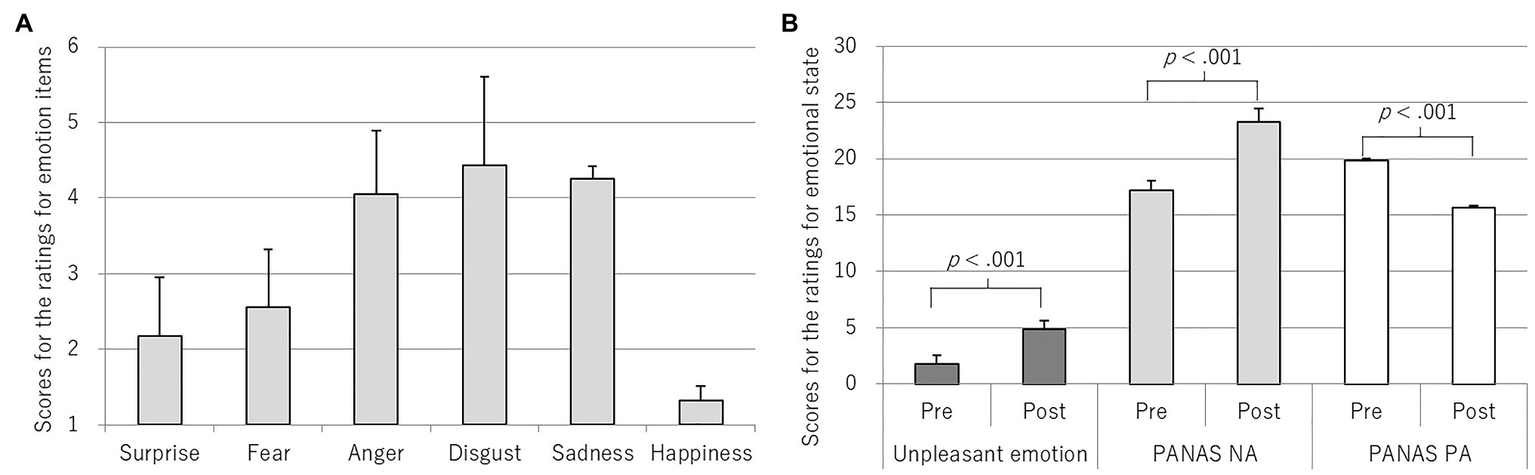 The pre- and post-score comparison of the PANAS NA or PA and unpleasant-emotion item indicated validated emotional changes. The effect sizes were almost the same as our previous experiment in Ozawa et al. (2020) (PANAS NA, d = 0.60; PANAS PA, d = 0.57; and unpleasant-emotion item, d = 1.83). Thus, this method indicated replicability and reliability. Regarding relationships between these tools and the six emotions, increase in the PANAS NA and decrease in the PANAS PA were associated with the extent of sadness and fear (Table 3). Thus, these scales were especially reflective of the emotional group of sadness and fear, although the PANAS NA scale is known to assess subjective distress regarding various negative mood states (Watson et al., 1988). On the contrary, an increase in an unpleasant emotion was associated with multiple emotional groups (increase in anger and sadness, and a decrease in happiness). That may be because the meaning of “unpleasant” would differ depending on individual episodes. Notably, the unpleasant-emotion item was also unique in involving assessment of anger, which is the important emotion in the present context.