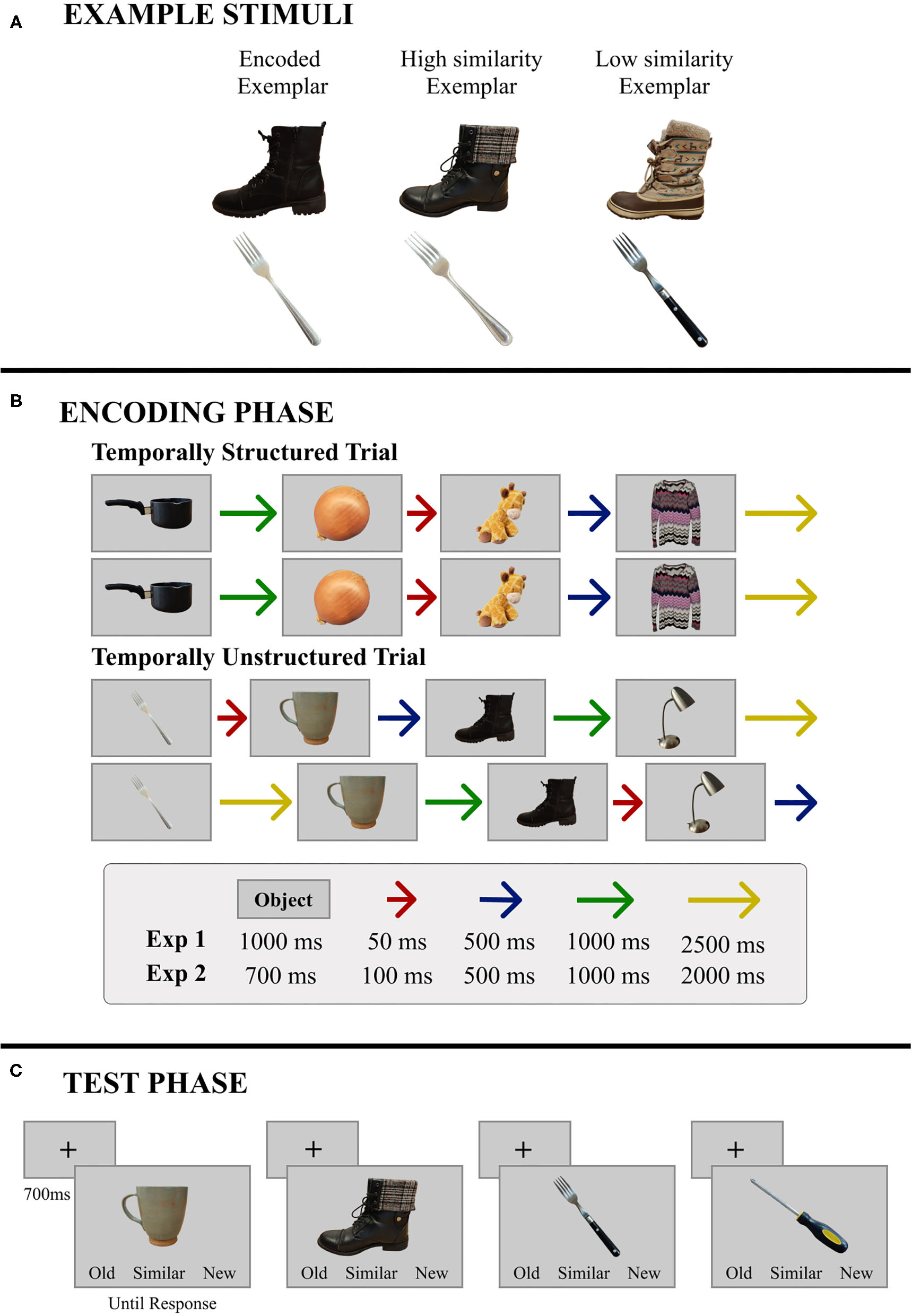 Representative materials and trial structure for Experiments 1 and 2. (A) Two base objects are illustrated here along with the corresponding high- and low-similarity exemplars. (B) During encoding, objects were presented in sets of four, and immediately repeated. The patterns of ISIs remained the same across repetitions and trials in the temporally-structured block, and were independently randomized for repetitions and across trials in the temporally-unstructured block. Specific timing parameters were different for Experiments 1 and 2. (C) During test, a single object was presented on every trial. Objects were either studied, similar to objects that had been studied, or new. In this example, the boot is a high similarity exemplar and the fork is a low similarity exemplar; the screwdriver is new. Objects remained in view until participants made a button press response—old, similar, or new.