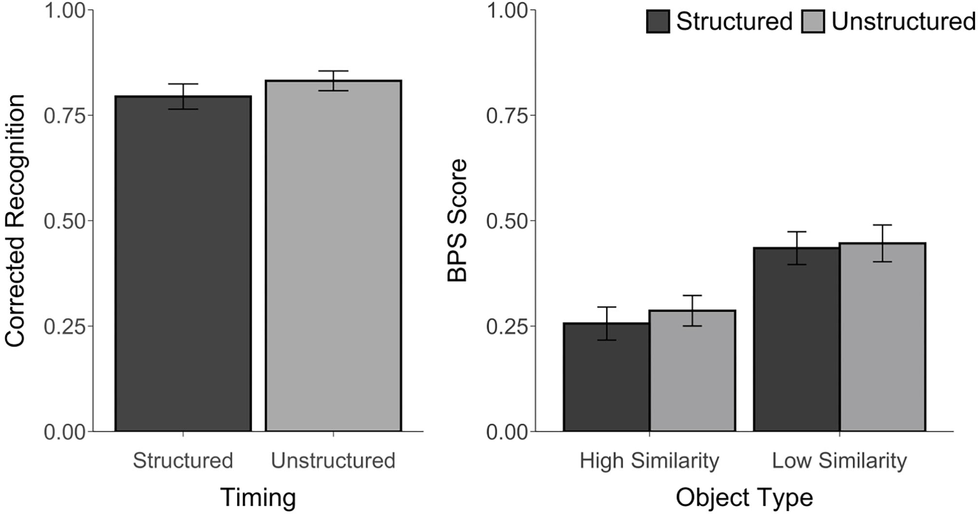 Recognition accuracy measured by corrected recognition (hits minus false alarms) and BPS scores (proportion of similar objects correctly endorsed as “similar” minus the proportion of new objects incorrectly called “similar”) from Experiment 1. Error bars represent standard error of the mean.