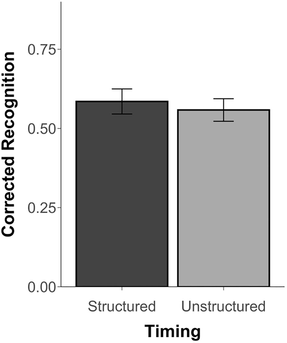 Since Experiment 3 did not include similar scenes, results are limited to corrected recognition scores (Hits minus False Alarms) and d′ scores, which were above chance for both the structured and unstructured blocks, t's ≥ 11.48, p's < 0.001, d's ≥ 2.34. However, unlike Thavabalasingam et al. (2016), performance was not affected by timing, t(23) = 0.68, p = 0.50, d = 0.15, BF = 0.27 (see Figure 4). Similarly, there was no difference in the d′ scores between the structured (M = 1.83, SD = 0.78) and unstructured blocks (M = 1.69, SD = 0.62), t(23) = 1.00, p = 0.35, d = 0.20, BF = 0.33. The proportion of hits, misses, false alarms, and correction rejections for both blocks is reported in Supplementary Table 3.