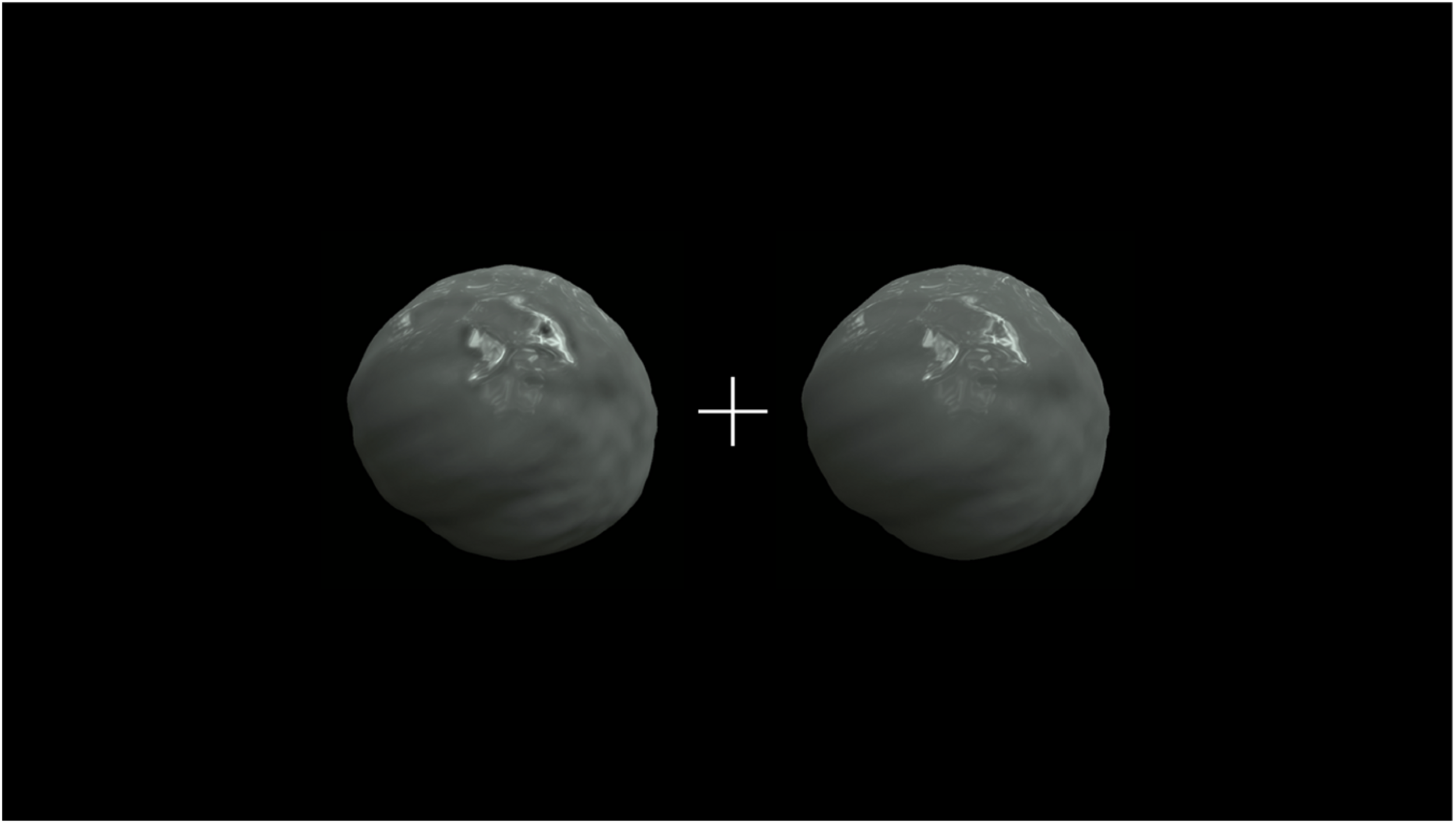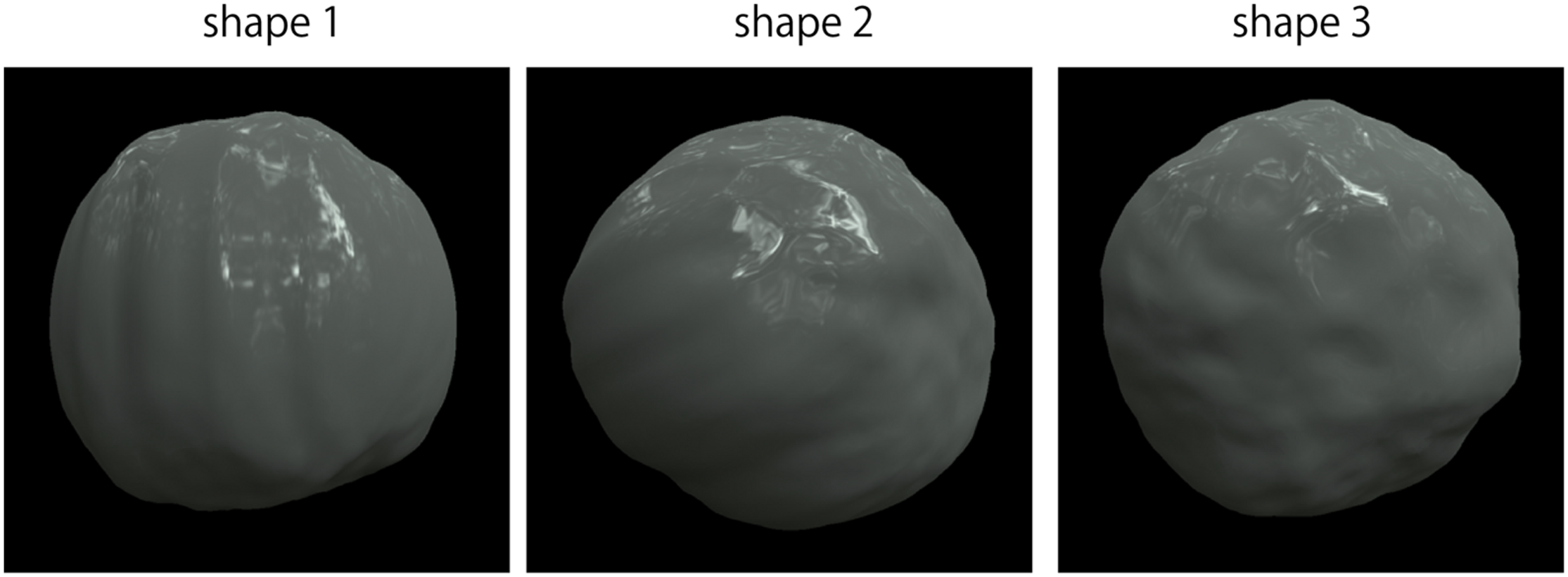 The test stimulus was a computer graphics image, but its luminance was changed after rendering, as described in the next paragraph. The computer graphics images were created as follows. Blender 3D (ver. 2.79b; Blender Foundation, 2018) was used to model the stimulus objects’ shapes. The shape was created based on a UV sphere, a primitive sphere shape composed of horizontal and vertical meshes in Blender 3D. The UV sphere with 6,146 vertices was deformed into a potato-like shape using the displace function, a built-in function of Blender 3D, based on randomly created cloud pattern textures with a deformation strength of 0.25. The surfaces were smoothed using the built-in smoothing function. The three shapes shown in Figure 2 were made in this manner. The object images were rendered using Rendertoolbox3 (Heasly et al., 2014) in collaboration with Mitsuba renderer (Jakob, 2010). The test stimulus was created from a weighted linear addition of the images of a fully specular object and a fully matte object. Ward model (Ward, 1992) was adopted as the surface reflectance model of these objects. It has three physical parameters: specular reflectance ρs, diffuse reflectance ρd, and surface roughness α. Here, (ρs,ρd) of the fully specular object and fully matte object were (0.4, 0) and (0, 0.4), respectively. Then, a stimulus image was created according to the following equation:
