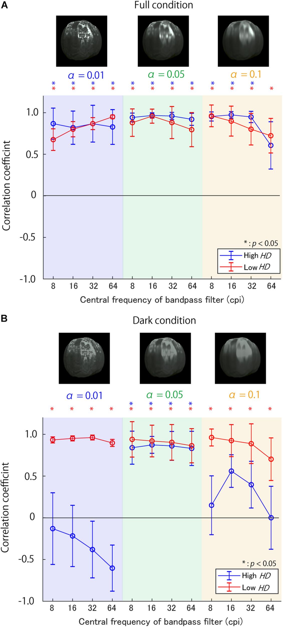 Correlation coefficients between sub-band contrast on various SFs and glossiness scores (A) in Full condition and (B) Dark condition. The background colors show the surface roughnessα, while the line colors denote the HD group. The asterisks indicate the conditions with significantly positive correlations. The error bars show ±1 standard error of means (SEM) of the correlation coefficients. The SEM was calculated using a bootstrap procedure; the bootstrapped correlation coefficients’ standard deviations were defined as SEMs. The object images above each figure are example stimuli in different αs.