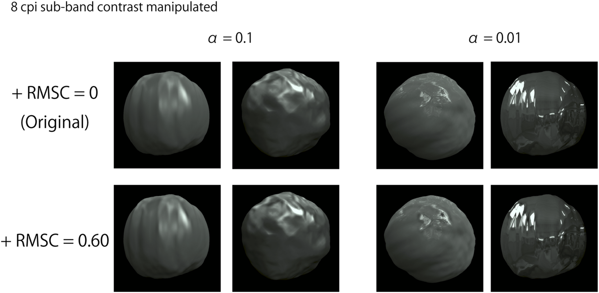 Figure 7 shows the “glossier” selection probability averaged across all observers for stimuli with 8 and 64 cpi contrast manipulation for two object images with αof 0.1 and 0.01. The contrast enhancement in 8 cpi (1.08 cpd) seemed to increase perceived glossiness on the object image with α of 0.1 (Figure 7A), but not on that with α of 0.01 (Figure 7B). On the other hand, the 64 cpi (8.65 cpd) contrast manipulation increased perceived glossiness on the object with α of 0.01 (Figure 7D), but not on the object image with α of 0.1 (Figure 7C). These results indicate that the enhancement of the sub-band contrast can increase perceived glossiness. However, the effectiveness of this image manipulation depends on the interaction between the target SF and surface roughness α.