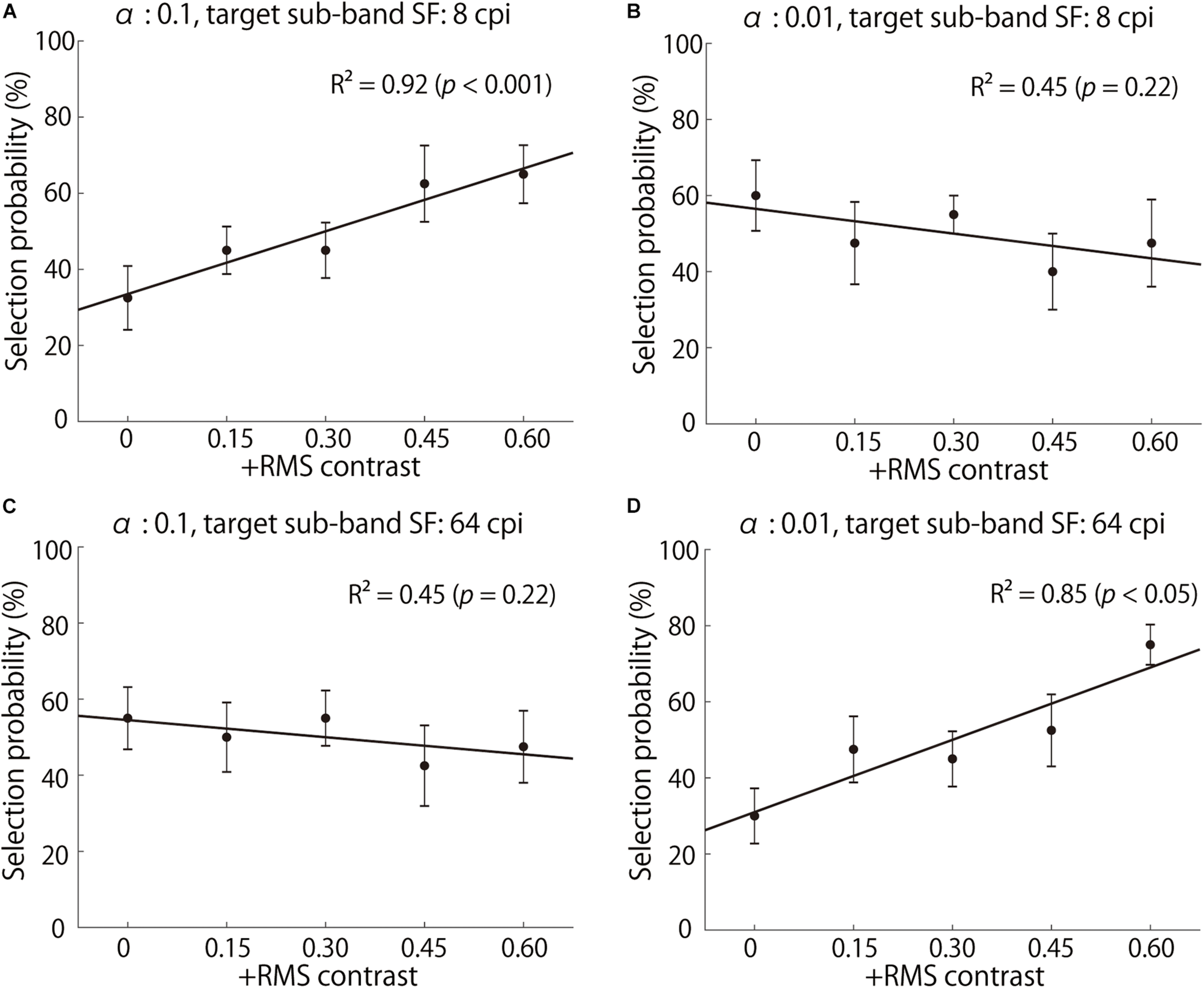 Selection probabilities averaged across observers. (A,B) show the results of 8 cpi (1.08 cpd) contrast-enhanced stimuli with α of 0.1 and 0.01, respectively. (C,D) show the results of 64 cpi (8.65 cpd) contrast-enhanced stimuli with α of 0.1 and 0.01, respectively. The x-axis indicates the increased RMS contrast, and the y-axis indicates a “glossier” selection probability. The solid lines represent the linear regression lines.