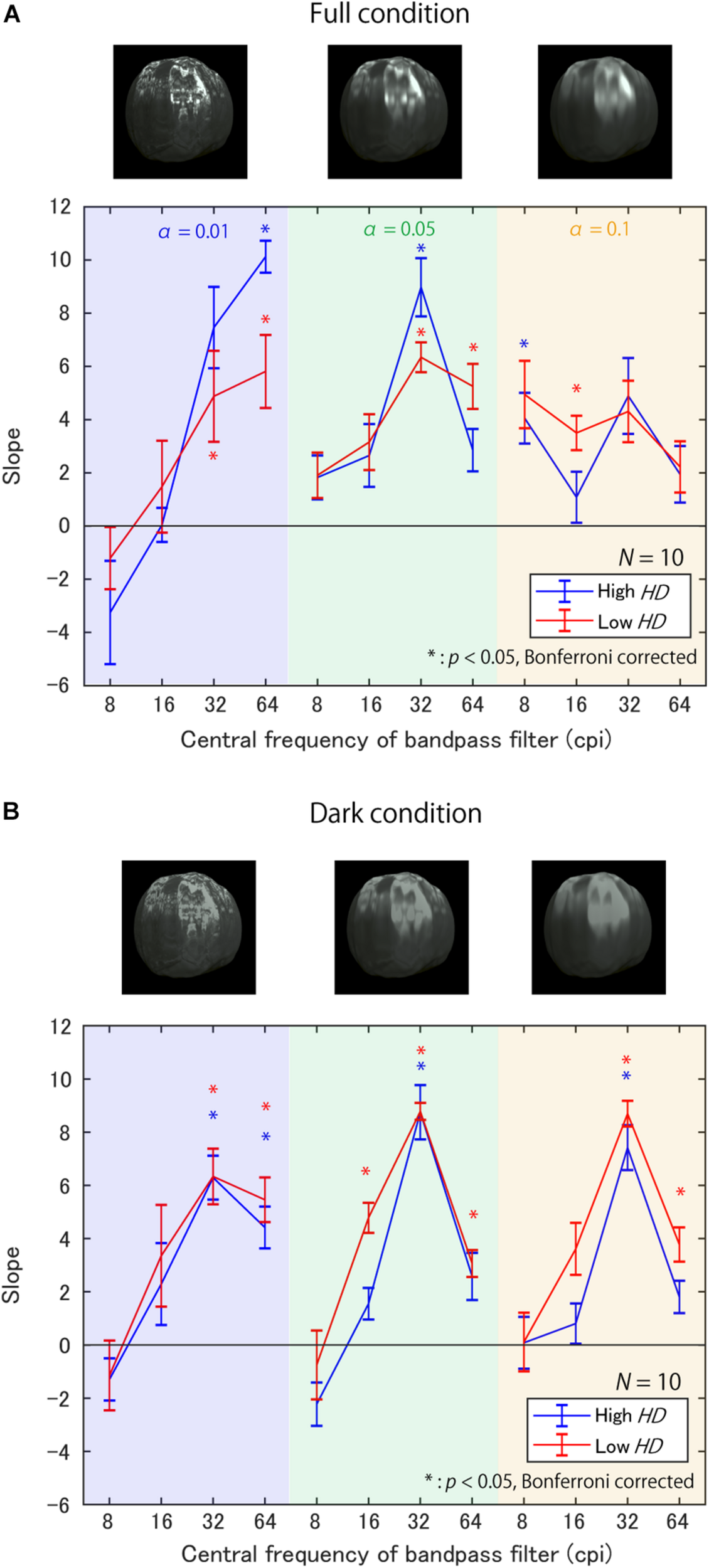 Figure 8A shows the slopes of the regression lines for each triad of α, target SF, and HD group in the Full condition. First, most of the slopes are positive, indicating that the sub-band contrast enhancement increased perceived glossiness, as expected. However, the SFs with maximum slopes vastly differed across surface roughness α; the SF with the maximum slope was 64 cpi (8.65 cpd) for α of 0.01 in both HD groups, but the maximum slope SF seems to decrease with an increase in α. These trends indicate that the effective SFs for the glossiness enhancement strongly depends on the fact that the higher the value of α, the lower the effective SF for a glossiness modulation. Conversely, the general trends do not differ between the high and low HD groups, except for the case of 64 cpi (8.65 cpd) and α of 0.01.