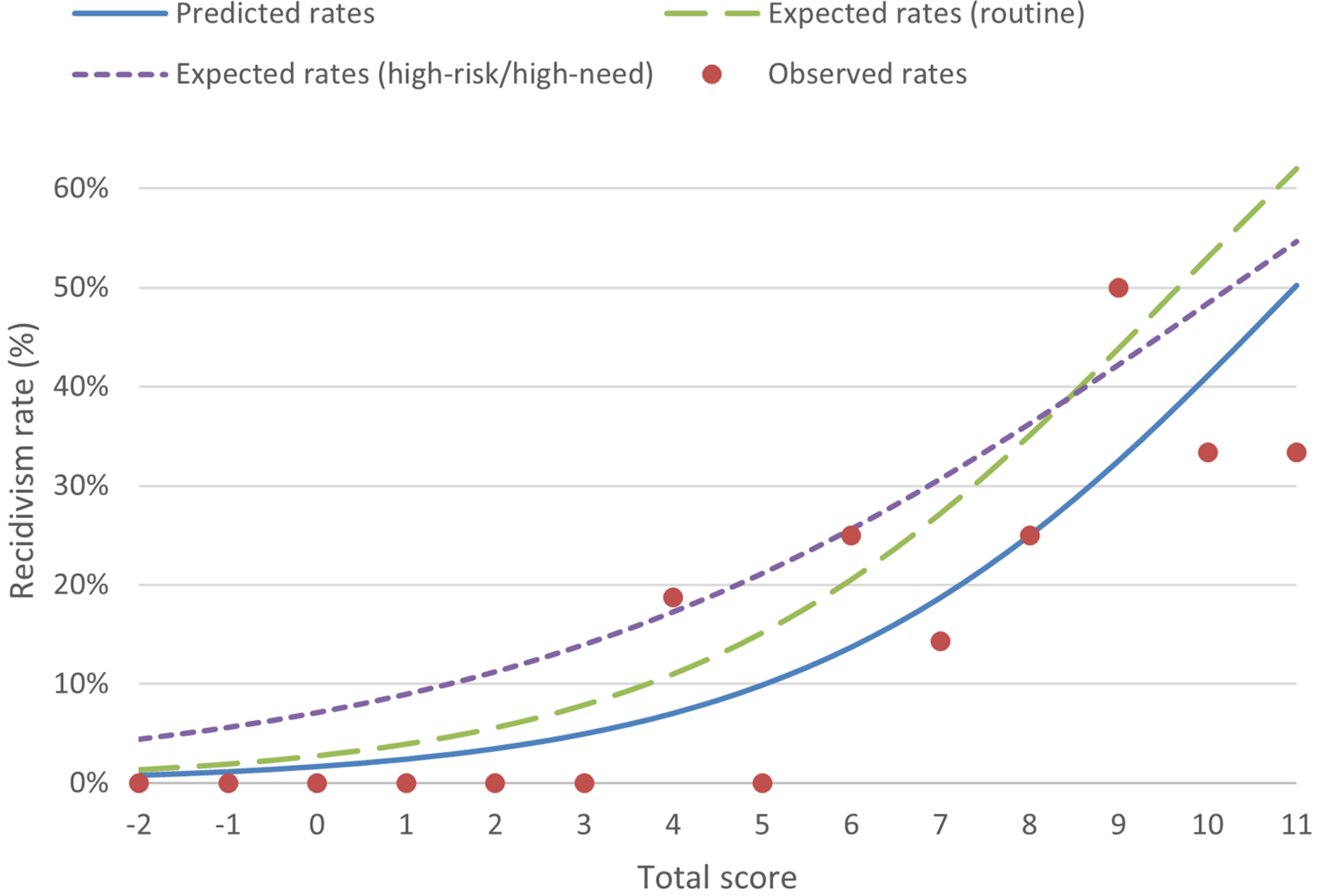 A calibration plot (Figure 2) visualizes the first 5 years after release in terms of predicted and observed recidivism rates for the study cohort (n = 100), as well as the expected recidivism rates calculated using the norms from the routine sample as well as from the high-risk/high-need sample. Predicted recidivism rates for the study cohort were consistently lower than the expected rates derived from the routine and high-risk/high-need samples.