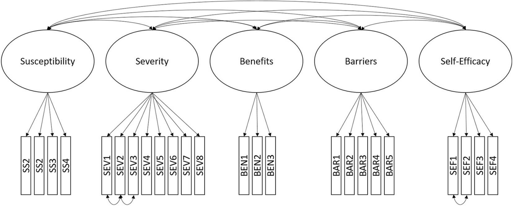 We subsequently fitted this model across both samples and found good configural fit, as well as metric invariance but not scalar invariance (see Table 4). This is a first important outcome from a cultural perspective; individuals in the two samples perceived and interpreted the constructs in a similar manner. Overall, this indicates that the current measurement model of the HBM works sufficiently well to explore the relationship with other variables across countries, but we are not in a position to compare mean differences with this measure, but only relative endorsement of perceptions (e.g., profiles). A conceptual representation of the model is shown in Figure 1 and all item loadings constrained across countries can be found in Supplementary Table 1.