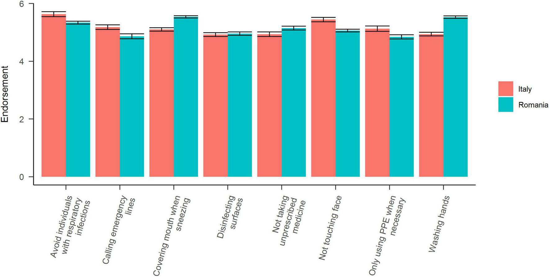 Overall, we found significant differences based on country [F(1,14928) = 10, 538.26, MSE = 3.27, p < 0.001], behavior [F(7,14928) = 22.57, MSE = 3.27, p < 0.001], and their interaction [F(7,14928) = 19.43, MSE = 3.27, p < 0.001]. In Romania the three most endorsed behaviors were: Avoiding contact with individuals that show respiratory symptoms, not touching one’s face, and calling emergency lines when experiencing fevers or coughs. The least endorsed behaviors in Romania were: Disinfecting surfaces, not taking non-prescribed medicine, and washing hands. In Italy the three most endorsed behaviors were: Covering one’s mouth/nose while sneezing our coughing, washing hands, and avoiding contact with individuals that show respiratory symptoms. The least endorsed behaviors in Italy were: Only using PPE when necessary, Calling emergency lines, and disinfecting surfaces (we show the results for both countries in Figure 2).