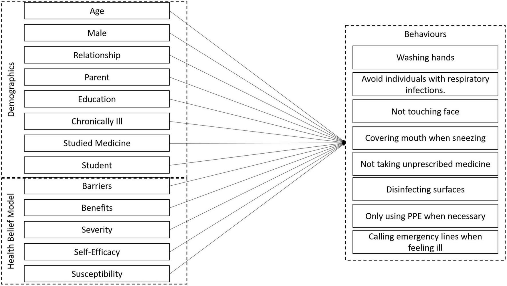 The context of COVID-19 requires evidence-based practices to provide more effective protection of the most vulnerable within a population. The importance of health beliefs in this context has been discussed by some authors (Czeisler et al., 2020; Ko et al., 2020) and HBM relevant variables such as risk perceptions have been shown to be on the minds of people across different cultural contexts (Iorfa et al., 2020; Sobków et al., 2020). We identified one contribution that relates health beliefs with health anxiety (Asmundson and Taylor, 2020). Overall, the potential of HBM has been clearly identified by a number of commentators, including for reinforcing behaviors that limit the spread of the virus (Carico et al., 2020), and for managing mental health concerns (Mukhtar, 2020). Focusing on empirical studies, a Polish study found that dark personality traits such as psychopathy correlated with health beliefs related to the COVID – 19 and undermined effective actions (Nowak et al., 2020). Another study Elgzar et al. (2020) found that HBM implemented within an educational program in Saudi Arabia increased students’ perceived susceptibility, severity, benefits and self-efficacy in overcoming perceived barriers in the adoption of protective and preventive behavior.
