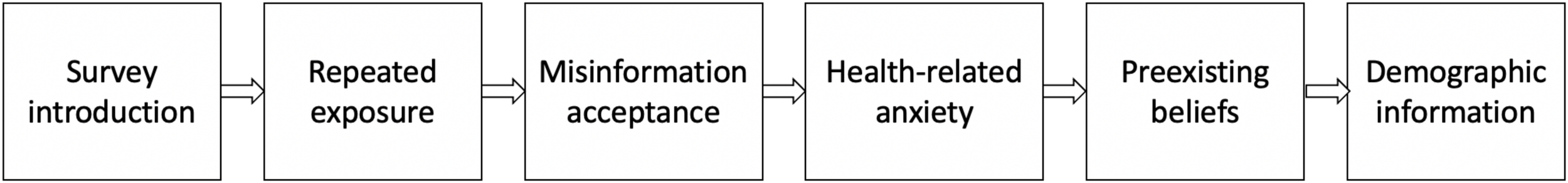 Participants were first presented with ten health-related items of misinformation. The criteria for misinformation selection in this study were based on the misinformation debunking messages released by the Jiaozhen fact-checking platform of Tencent News. The final misinformation items used in this study were selected based on popularity, frequency, and topics of misinformation. Participants were first asked to indicate whether they were aware of this misinformation item. They were then asked whether they believed it. After exposure to all ten pieces of health misinformation, they were asked about health-related anxiety, preexisting misinformation beliefs, and demographic information. The survey design can be found in Figure 1.