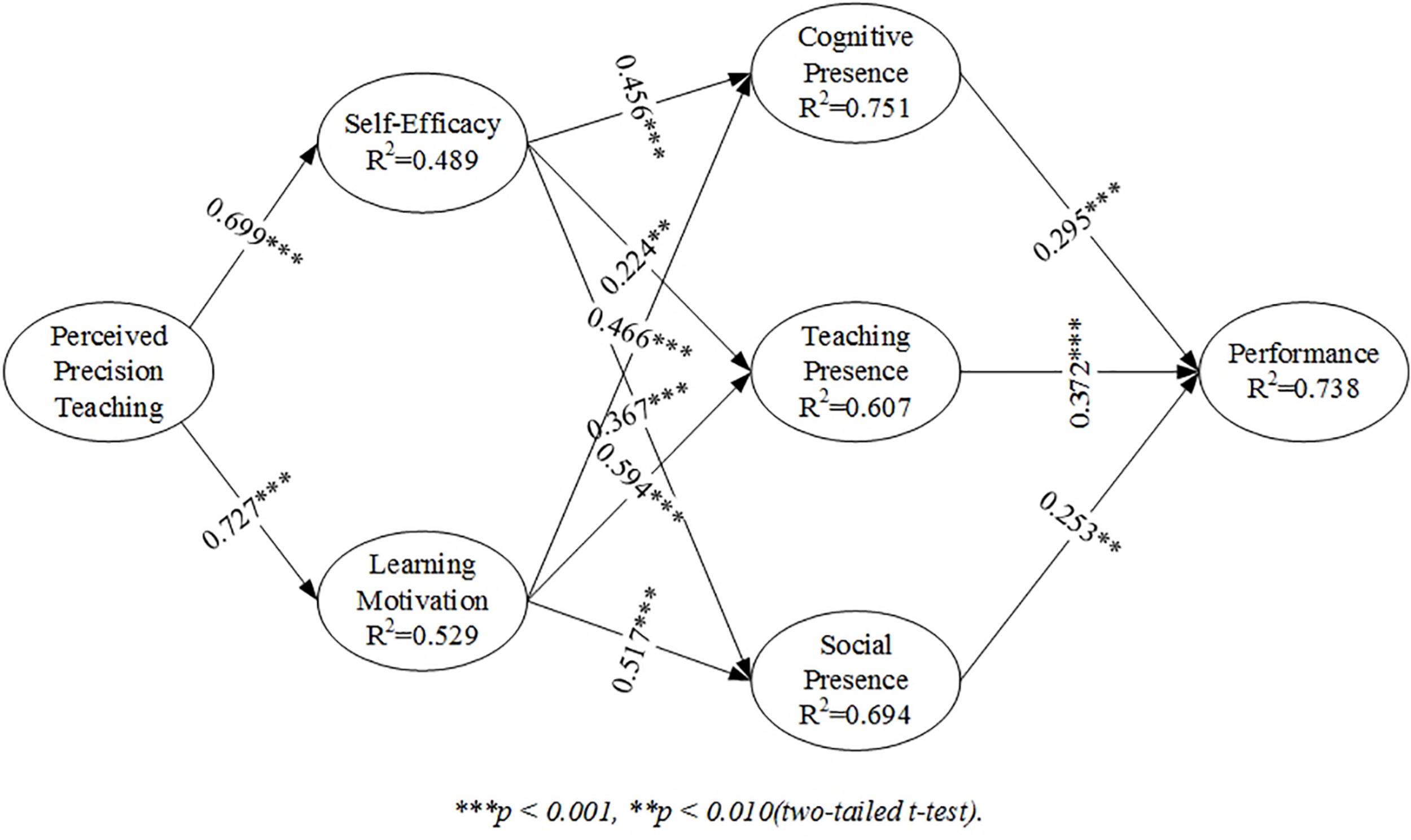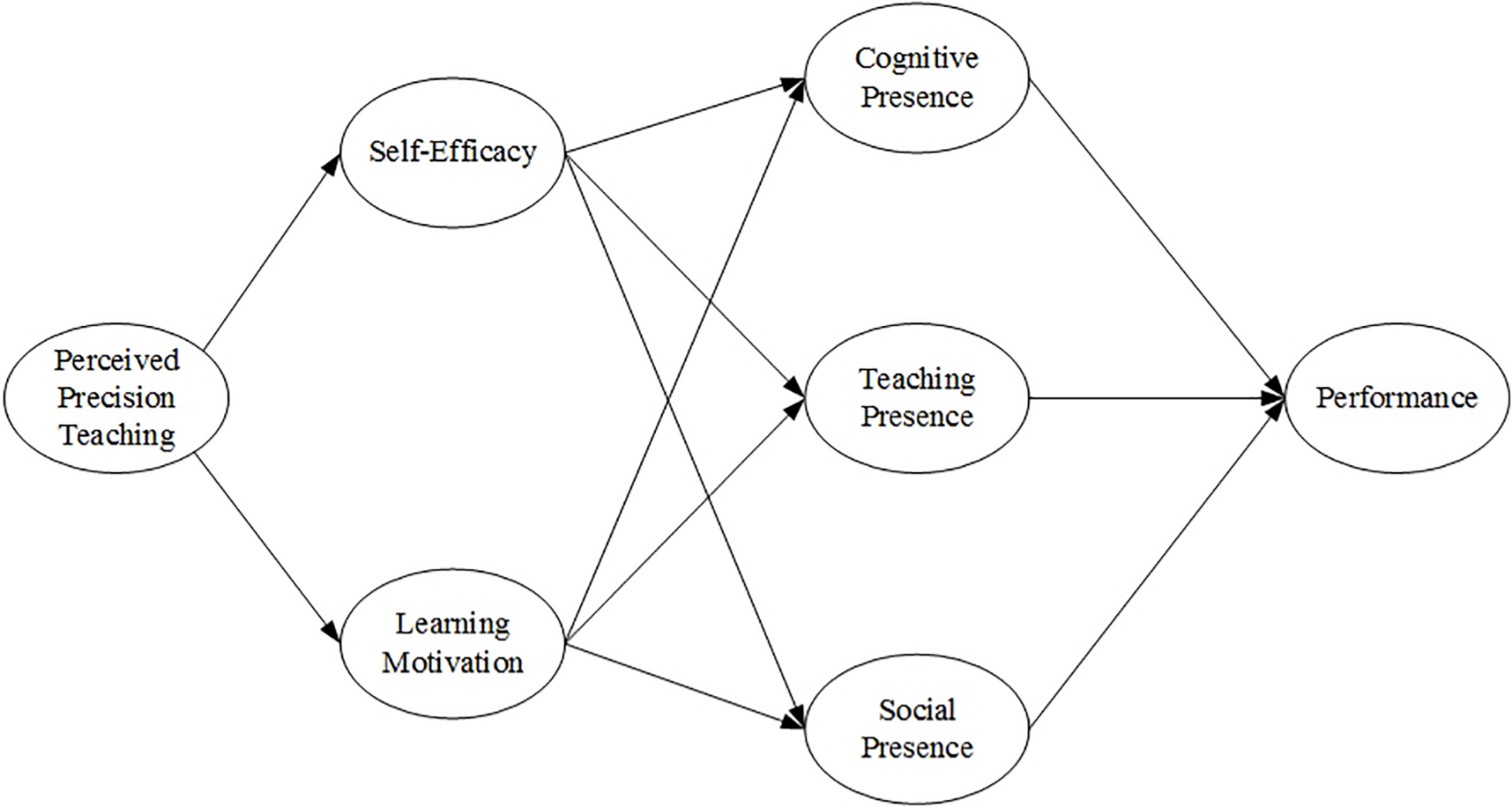 In a blended learning environment with precision teaching, teachers outline precise goals and requirements. In this case, students with high self-efficacy actively contact the teachers, discuss with their classmates, and finish the tasks as required. The higher the self-efficacy, the more active the students would be in sharing knowledge and engaging in discussions (Hsu et al., 2007), and thereby, the stronger would be the social presence that they experience. In the process, those with higher self-efficacy tend to make more efforts in learning and have a better perception of the carefully crafted atmosphere for teaching, that is, a better perception of teaching presence (Akyol and Garrison, 2011). In precision teaching, students preview the content and finish self-testing according to their goals before the lectures. During the lectures, teachers organize teaching and discussion based on the problems that have occurred in the self-learning and self-testing, and further test if the goals are achieved after the lectures. Students with higher self-efficacy can immerse better into the entire learning process (Christina, 2000; Park et al., 2012), which would increase the cognitive presence of learners (Celikkaleli, 2014; Niemiec and Lachowicz-Tabaczek, 2015). To examine the influence of self-efficacy in the blended learning environment, the following hypotheses are proposed: