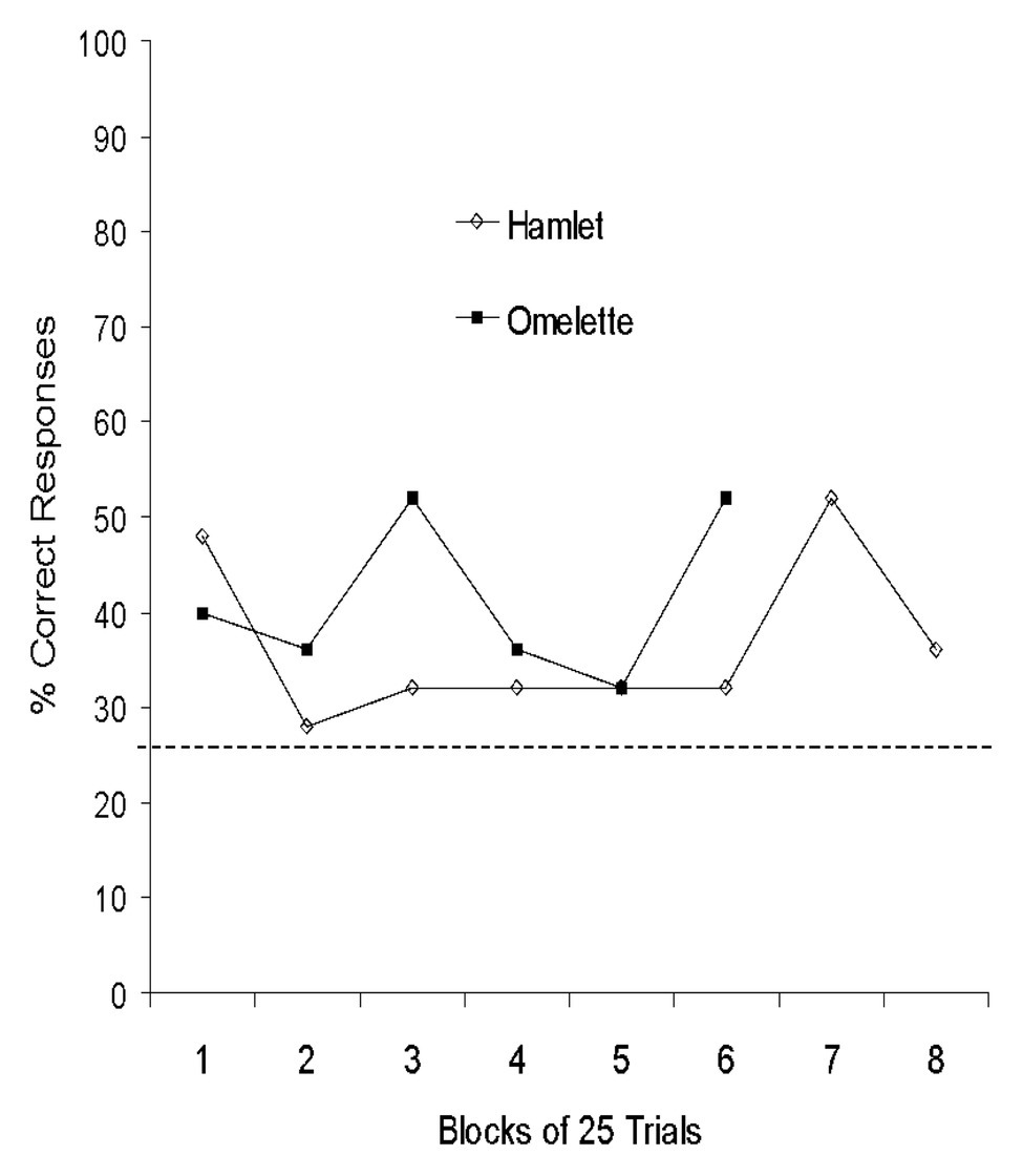 Terminal performance (last block of 50 trials) was compared to performance on the first block of 50 trials for each category of number of walls (3-, 2-, and 1-walls) and on target positions. Omelet showed no significant improvement on three- or one-walled targets over time, but did improve on two-walled targets (p < 0.05). Hamlet likewise improved on two-walled targets (p < 0.025), but not on three-walled targets. Surprisingly, his performance on three-walled targets actually declined toward the end of the experiment (p > 0.10). Hamlet’s performance on one-walled targets also did not improve significantly.