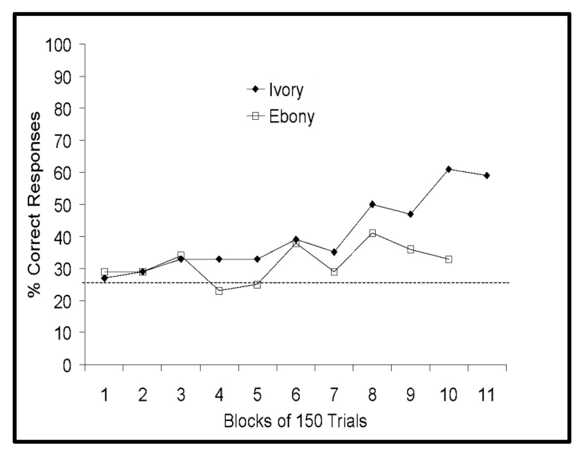 Due to limitations of the version of SIDE task software utilized, it was not feasible to electronically extract data in a manner that would have permitted accurate, detailed analyses of error patterns for each individual. Future programming for similar or related tasks, indeed, for any species tested using advanced technology, should be sure to include the potential for such evaluation, as the error patterns observed and identified during some facets of the experiment may provide valuable information as to how information processing and physical manipulation of the joystick (or other manipulanda) subserve the animals’ resulting performance.