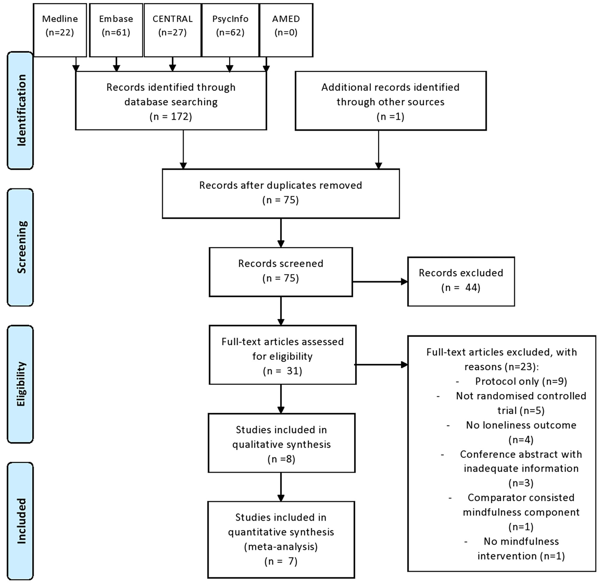 The search yielded 189 articles: 188 identified from electronic databases and one obtained by bibliography search. A total of 97 duplicates were removed. Of the remaining 92 studies screened, only 31 were relevant and were retrieved for full-text review. The full-text review revealed only eight studies that met the inclusion criteria. The 23 excluded studies were protocol (n = 9), not randomized controlled trial (n = 5), no loneliness outcome (n = 4), conference abstract with inadequate information (n = 3), comparator-consisted mindfulness component (n = 1), and no mindfulness intervention (n = 1). This review included eight trials involving 815 participants. Figure 1 shows the flow diagram of this study selection.