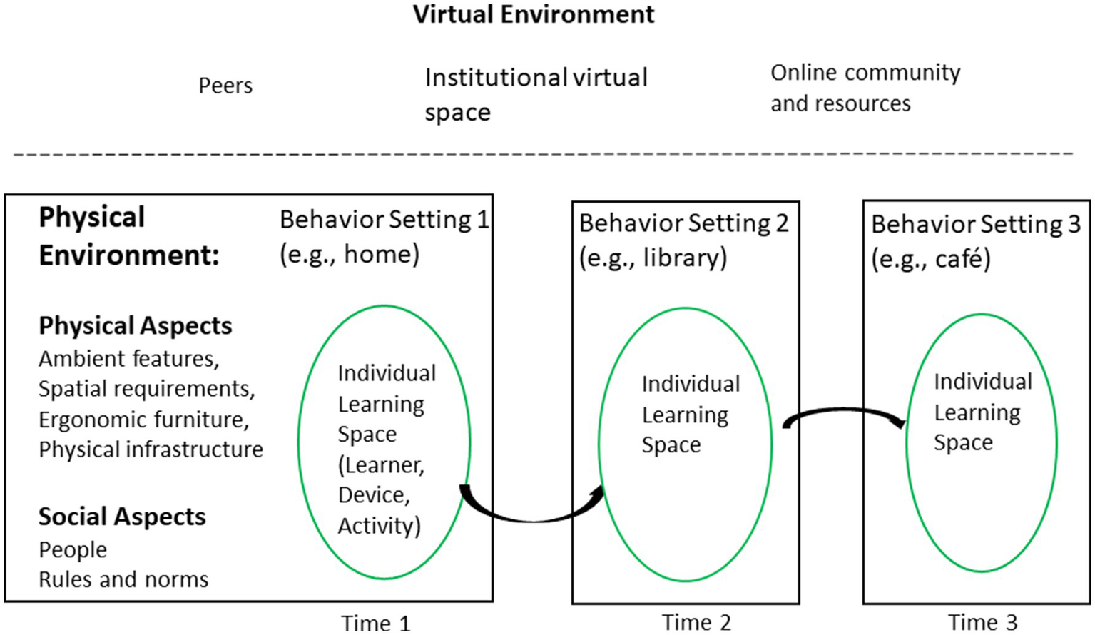 At any one time, an online learner’s individual learning space is embedded within one of several traditional behavior settings (e.g., home, library, workplace, café, and public transport). The learner carries out a number of learning activities (e.g., writing an essay, communicating with instructor, and taking photos) using technological devices that the learner has (e.g., desktop PC) or carries with him or her (e.g., smart phone) and furniture and equipment provided within that setting (e.g., a desk at home, a small table at a cafe, and wireless connectivity). The learning activities can be supported or hindered by the physical and social aspects of that behavior setting. At the same time, the learner is connected to the learner’s institutional virtual learning space, peers, and online community and resources, which can also provide support or present obstacles for the performance of learning activities. Over time, if and when the learner moves from one behavior setting to the next, a new set of activities, and supports and constraints may take over. The learner has the capacity to connect to the virtual environment via the Internet.