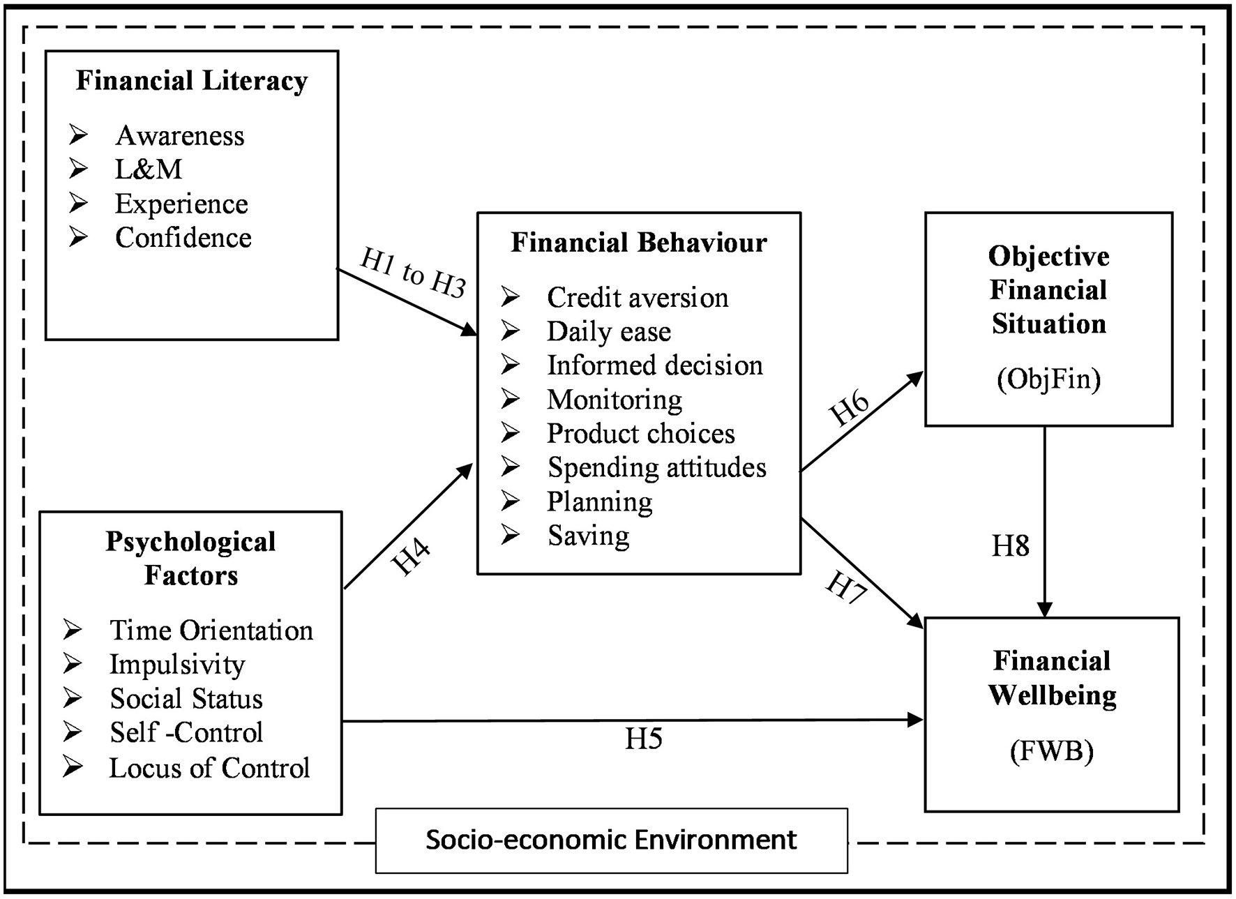 The elaborated conceptual model for this study, with additional interlinkage among the constructs, is illustrated in Figure 2. The model proposes that given a socio-economic environment, individuals with a high level of financial literacy are expected to have responsible FinBs, which are also influenced by the presence of positive psychological factors. Further, responsible FinBs are expected to affect FWB positively. This relationship can be either: (a) direct relationship, where particular FinB will affect perceptions of an individual of their FWB irrespective of how they are actually/objectively doing financially, or (b) indirect relationship, where particular FinBs will affect the objective financial situation, which would then possibly influence perceived FWB.
