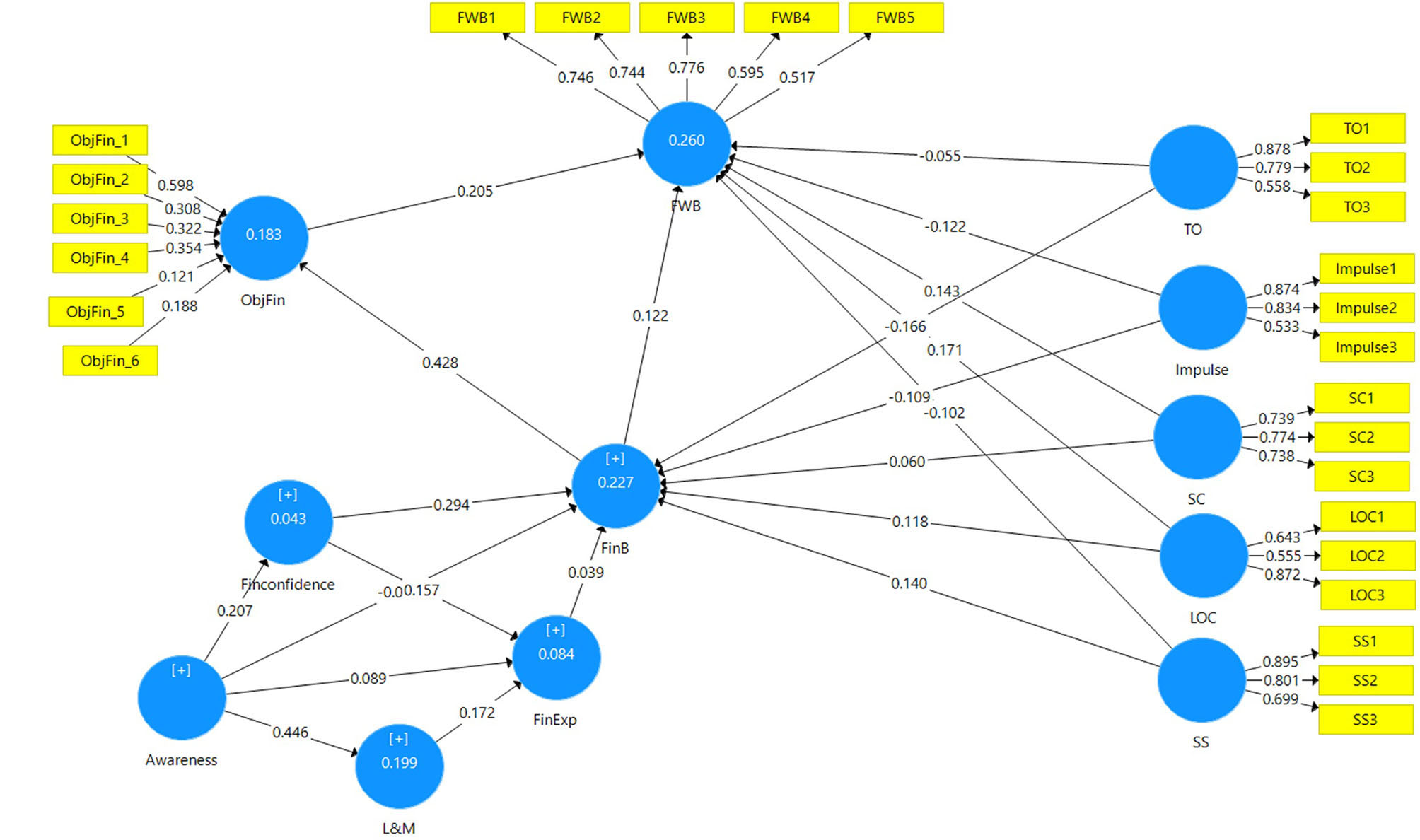 H8: There is a positive and significant association between ObjFin and perceived FWB.