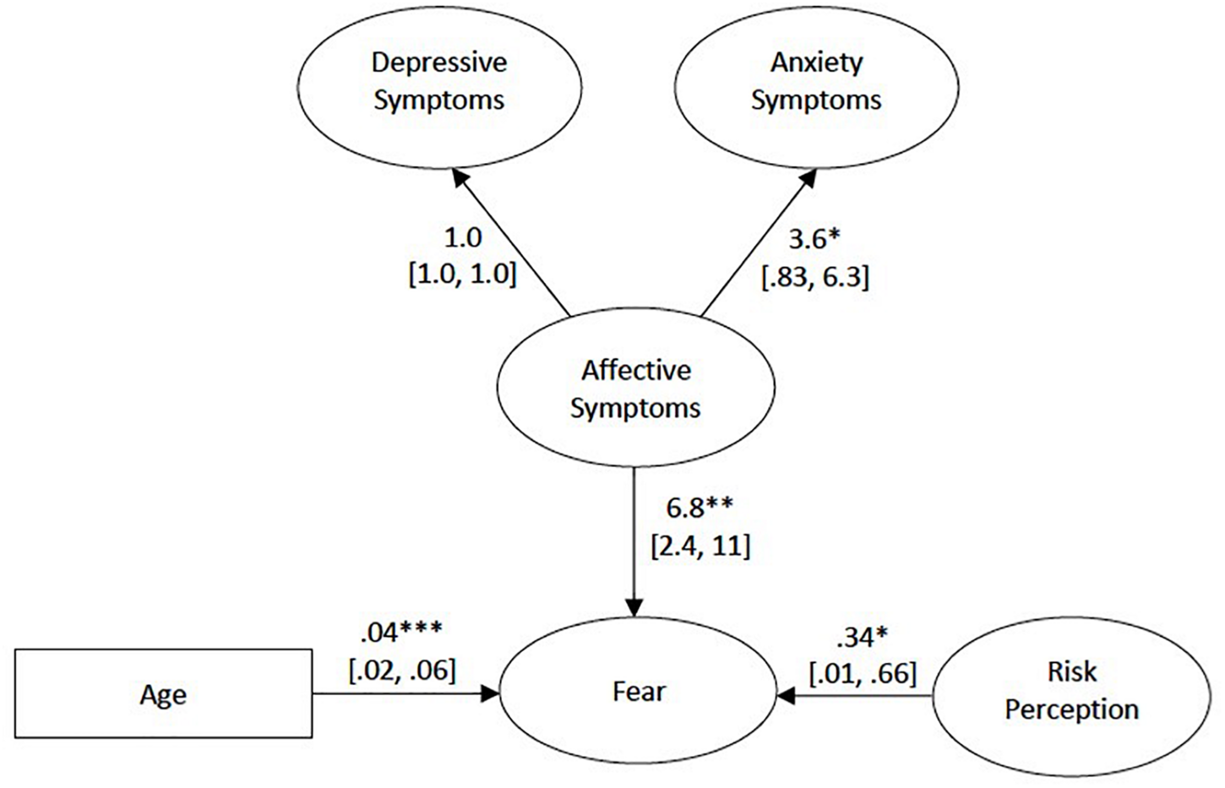 Final model. Unstandardized regression estimates are shown. Ovals represent latent variables, while the rectangle represents the observed variable. Correlated errors among the items in the COVID-19 Fear Inventory are not shown for clarity. Statistical significance for the path between depressive and affective symptoms was not tested as it was set to 1. Figures in brackets represent the Confidence Intervals. *p < 0.05, **p < 0.01, ***p < 0.001.