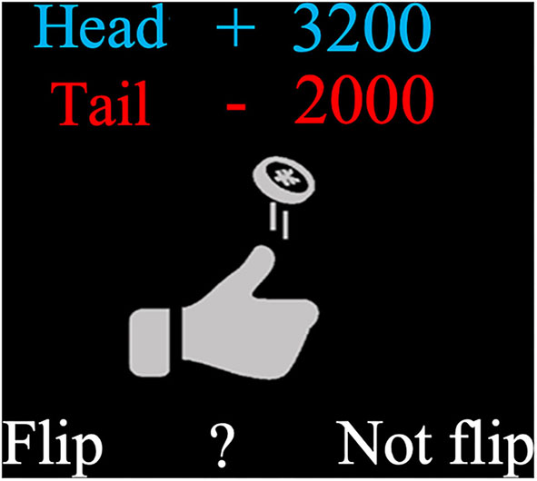 Illustration of a typical trial. On each trial, subjects had to decide whether to accept or reject a coin-toss gamble that offered equal (50%) chances of gaining or losing different amounts of money.