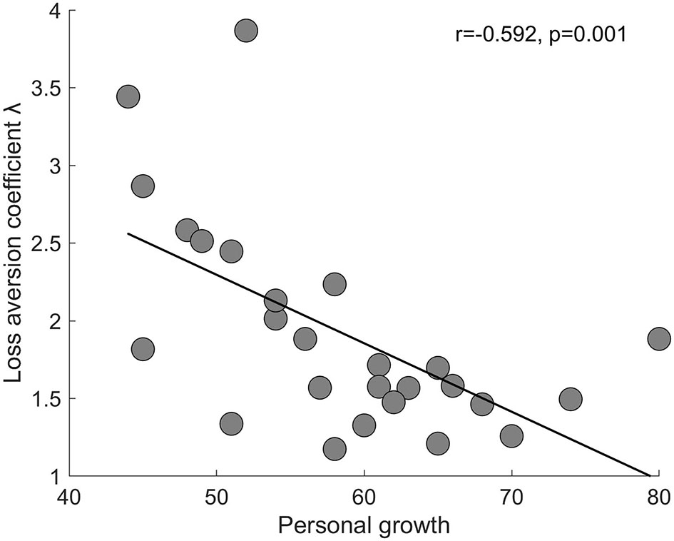 Here, personal growth measures an individual's sense of continued psychological development (or improvement) as well as the tendency to pursue such development, for instance, through having new experiences that challenge oneself or broaden one's horizons (Ryff, 1989). It is possible that this kind of seeing growth in oneself and being open to new experiences restrains one's tendency to overweigh the impact of losses compared to gains. This speculation is consistent with the observation that individuals with more positive psychological wellbeing including personal growth show increased activation in the ventral ACC and reduced activation in the amygdala when confronted with potentially aversive information (Van Reekum et al., 2007). In other words, these individuals demonstrate typical brain activations that indicate reduced LA.