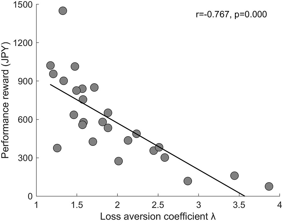Scatter plot (with a regression line) of the association between LA coefficient λ and performance reward (JPY). Each circle represents a subject. n = 26.