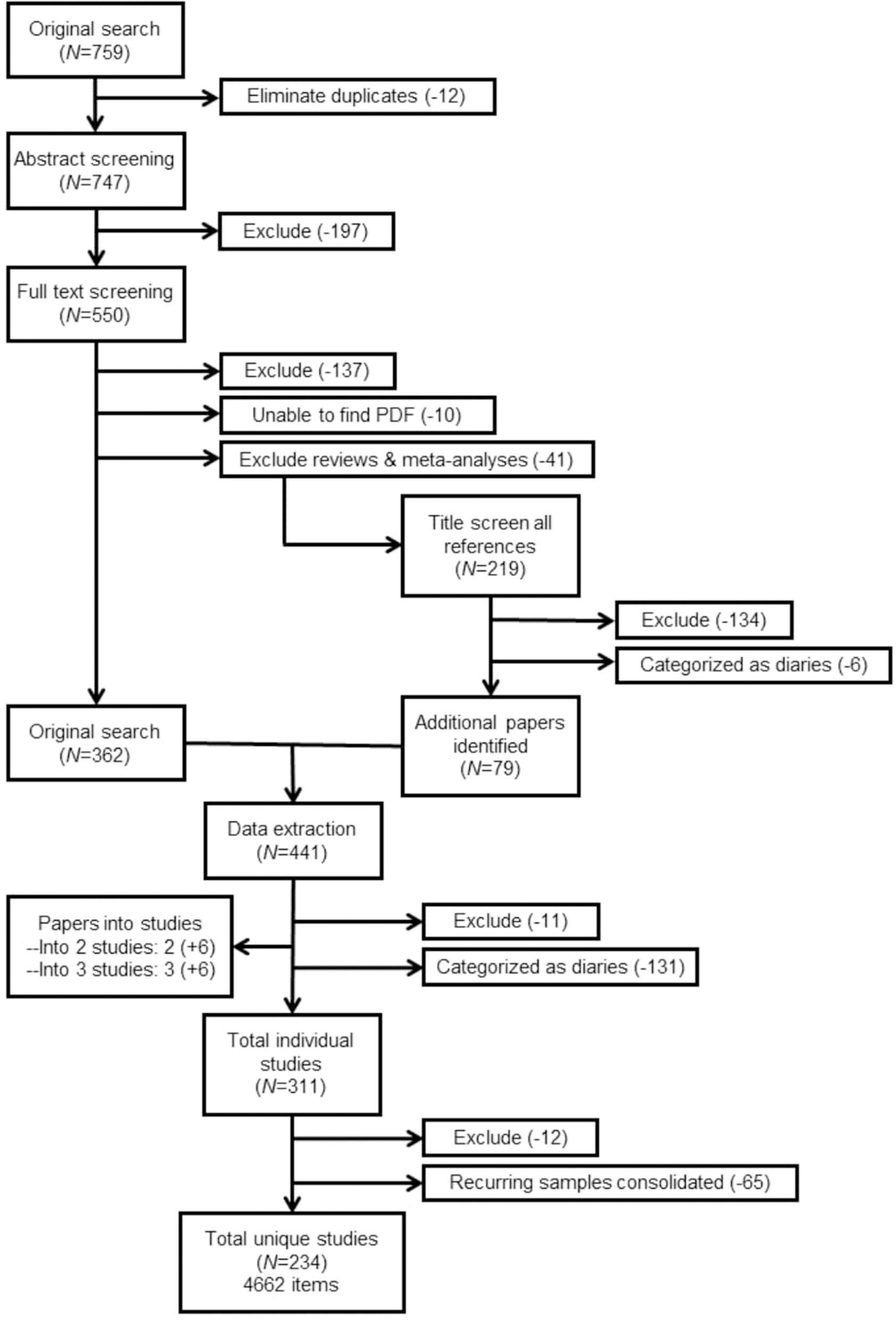The following search terms were used for all databases (with only minor alterations to accommodate for differences across databases): (“diary” OR “momentary assessment” OR “experience sampling” OR “event sampling” OR “EMA” OR “ESM”) AND (“anxiety disorder*” OR “phobi*” OR “panic disorder” OR “PTSD” OR “post-traumatic stress disorder” OR “obsessive-compulsive disorder” OR “acute stress disorder” OR “agoraphobi*” OR “OCD” OR “GAD” OR “affective disorder*” OR “mood disorder*” OR “bipolar disorder*” OR “major depression” OR “MDD” OR “dysthymia”).