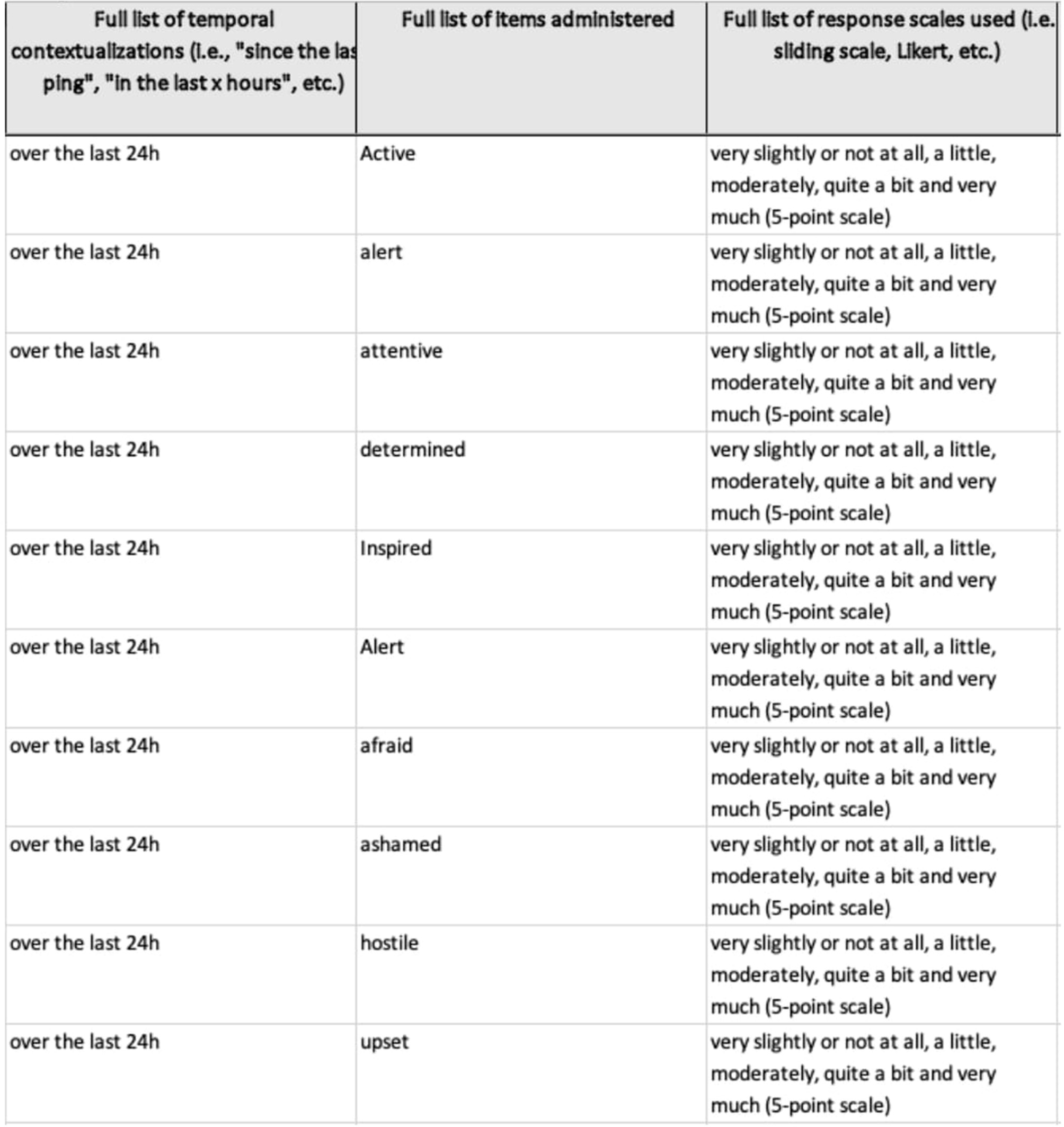 Items were temporally contextualized with language such as “today,” “since the last beep,” “in the last 15 min,” and “right now,” all of which clearly aim to measure constructs at different moments in time: in the moment, within a specific time frame, or over the course of a full day. Though these differences may seem minute, participants may respond more accurately to some time-specific prompts than others (Stone et al., 2020). For example, participants seem to struggle to accurately report responses when “during the last 24 h” is used, whereas “today” or “since waking up today” seemed to improve the accuracy with which participants responded (Stone et al., 2020). Given these reporting differences, it seems likely that similar, if not more pronounced differences would exist across prompts referring to different timeframes. Overall, we recommend that EMA researchers examine the literature to justify what level of granularity they require to capture the constructs they are interested in. However, more research is required to determine the extent to which differences in prompts impact participant ratings, particularly for more granular time-frames (e.g., “since the last ping” vs. “in the last 2 h”). In the meantime, we hope that our database helps researchers find other groups who share similar research questions and may open a dialogue about best practices, depending on the research group's specific goals and interests.