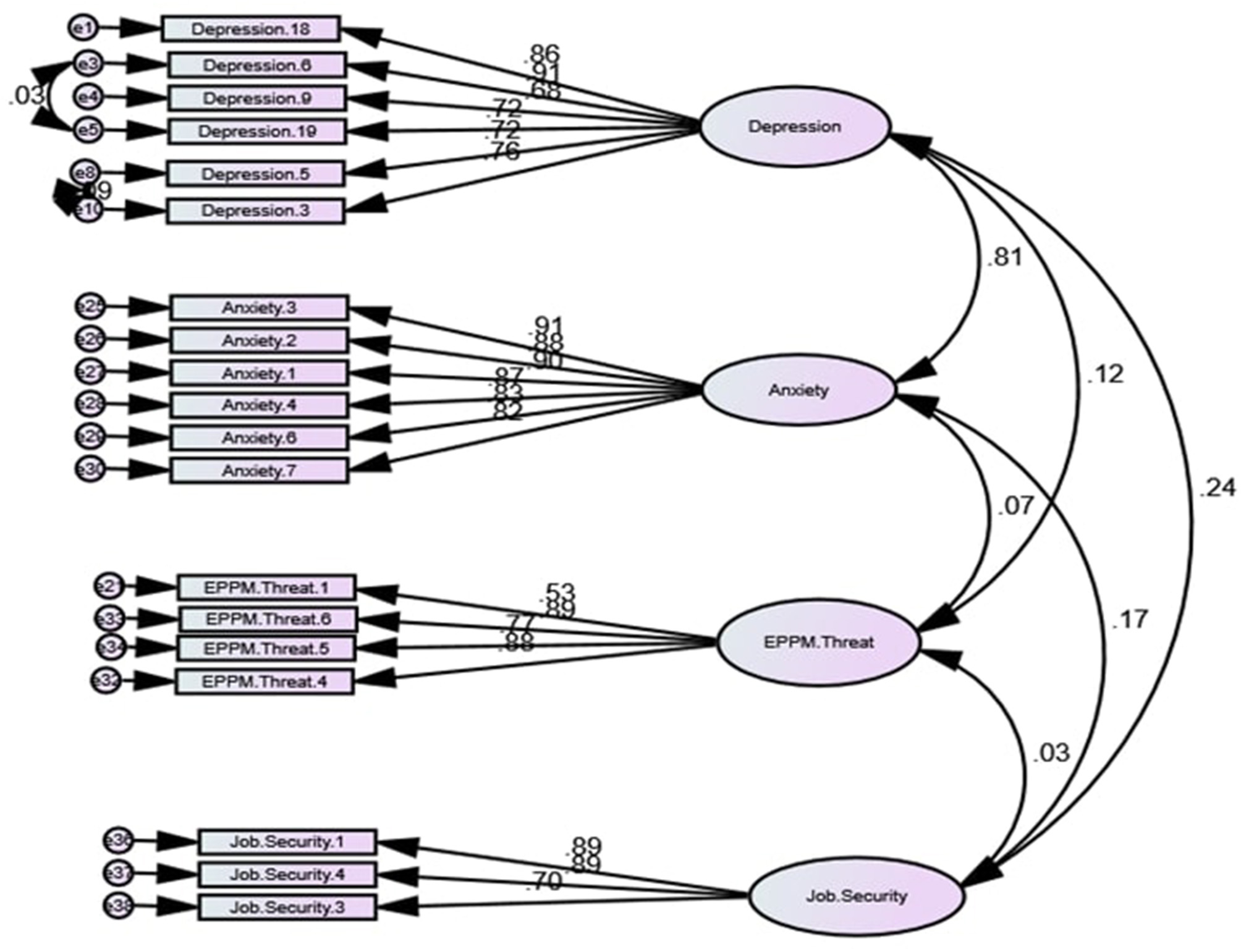 Table 3 illustrates the standard regression weights between latent variables and observed ones. Items in the constructed survey represent observed components of the latent variables such as Depression, Anxiety, EPPM threat and Job Security. Thus, Anxiety 1 or Depression 18 represents item 1 of the Anxiety construct and item 18 of the Depression construct. All the standard regression weights represented in Table 3 are above 0.5.