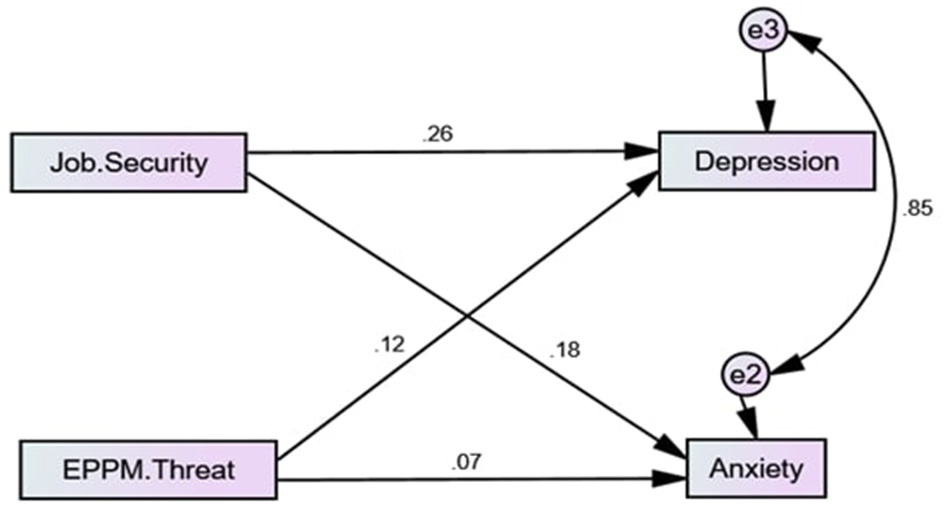 The data received were cleaned, missing values excluded, and prepared for further testing. Analysis was performed on the sample of 347 respondents. In the structural model testing with SEM, relationships between EPPM threat, job insecurity, and anxiety and depression were examined. Path analysis has been performed, and standardized parameter estimates, standard errors, and p-values for the structural model were computed. The initial confirmatory factor analysis test showed that the model needs further improvements (χ2/df = 3.754; CFI = 0.798; SRMR = 0.08; RMSEA = 0.053). χ2/degrees of freedom ratio is higher than the recommended value of 3 (Hair et al., 2013). SRMR is equal to 0.08, which is the minimum requirement of good model fit (Byrne, 2010). CFI illustrates good model fit with a value below 0.95. While RMSEA indicates the need for model fit improvements with a value higher than the threshold of 0.05, it still meets the suggested level of < 0.08 (Ferdinand, 2002). Factor loadings of below 0.55 were deleted (Fornell and Larcker, 1981), consequently improving the model fit.
