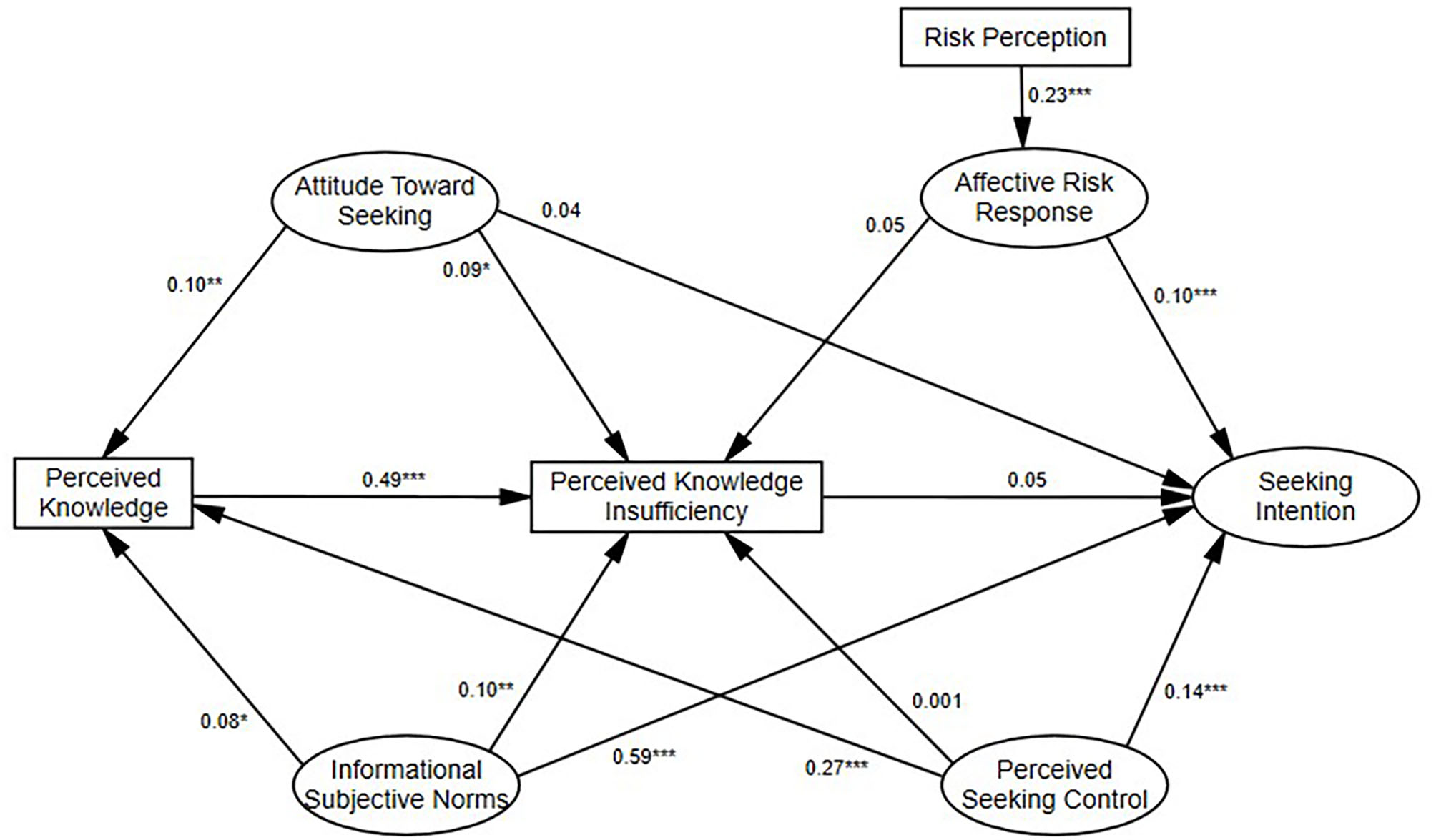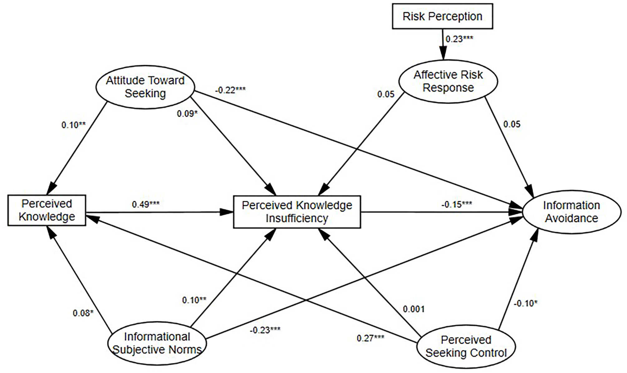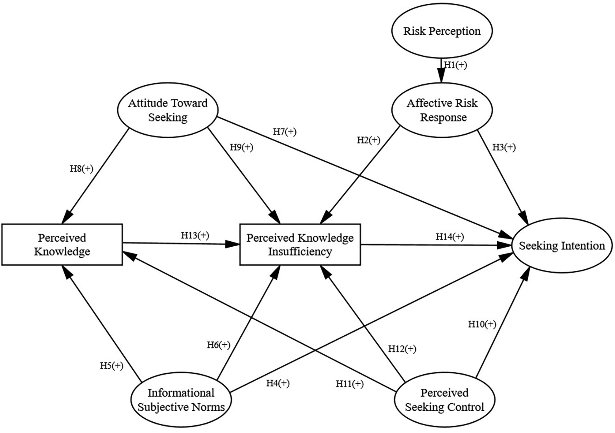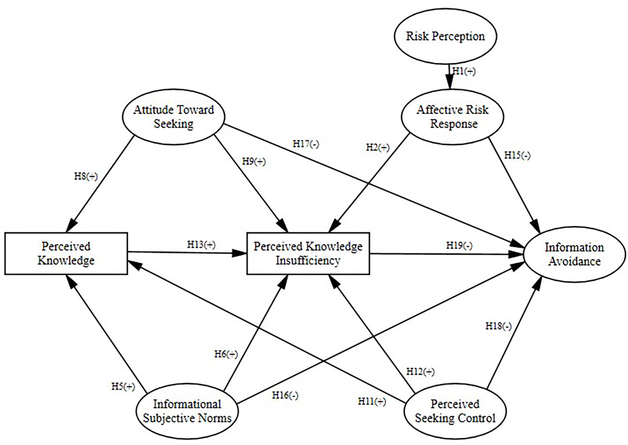 According to Ajzen (1991), attitude toward seeking information within PRISM, rooted in TPB, refers to an individual's assessment of whether information seeking would be beneficial to him or her. If an individual perceives that performing the behavior (information seeking) would be in his or her favor, the individual will be more likely to perform the behavior, while less likely to avoid it, just for this reason that attitude toward information seeking is negatively related to information avoidance (Yang and Kahlor, 2013; Howell et al., 2016). That is, when individuals have more positive attitudes toward seeking risk information, they are less likely to avoid it. Other research has shown that implicit attitudes about learning health information predicted risk information avoidance (Howell et al., 2016). Thus, we put forward the following hypotheses, which are supported by previous studies (Kahlor, 2010; Eastin et al., 2015; Kahlor et al., 2019; Hubner and Hovick, 2020): attitude toward seeking information will be positively related to seeking intention (H7), but negatively related to information avoidance (H17). In addition, we expect attitude toward information seeking to be positively related to perceived knowledge (H8) and perceived knowledge insufficiency (H9).