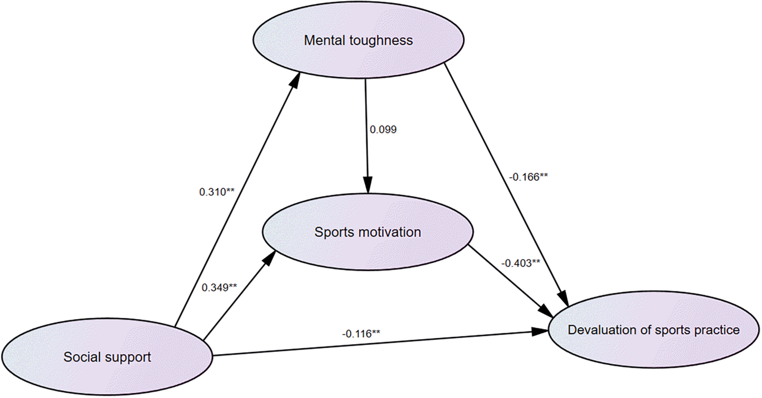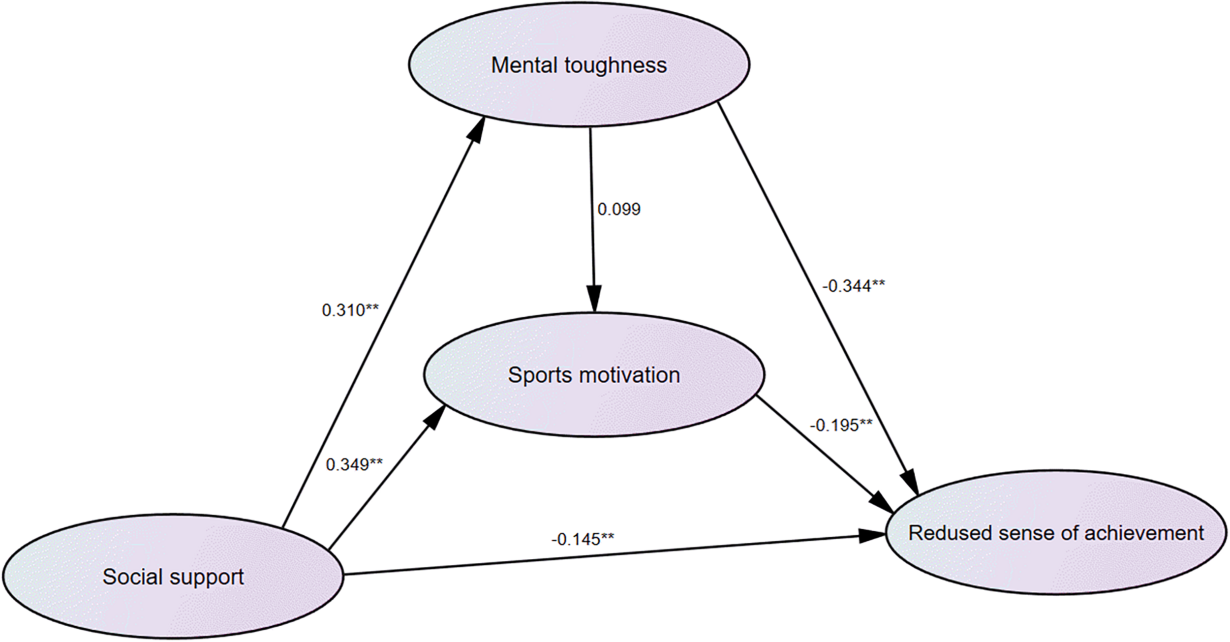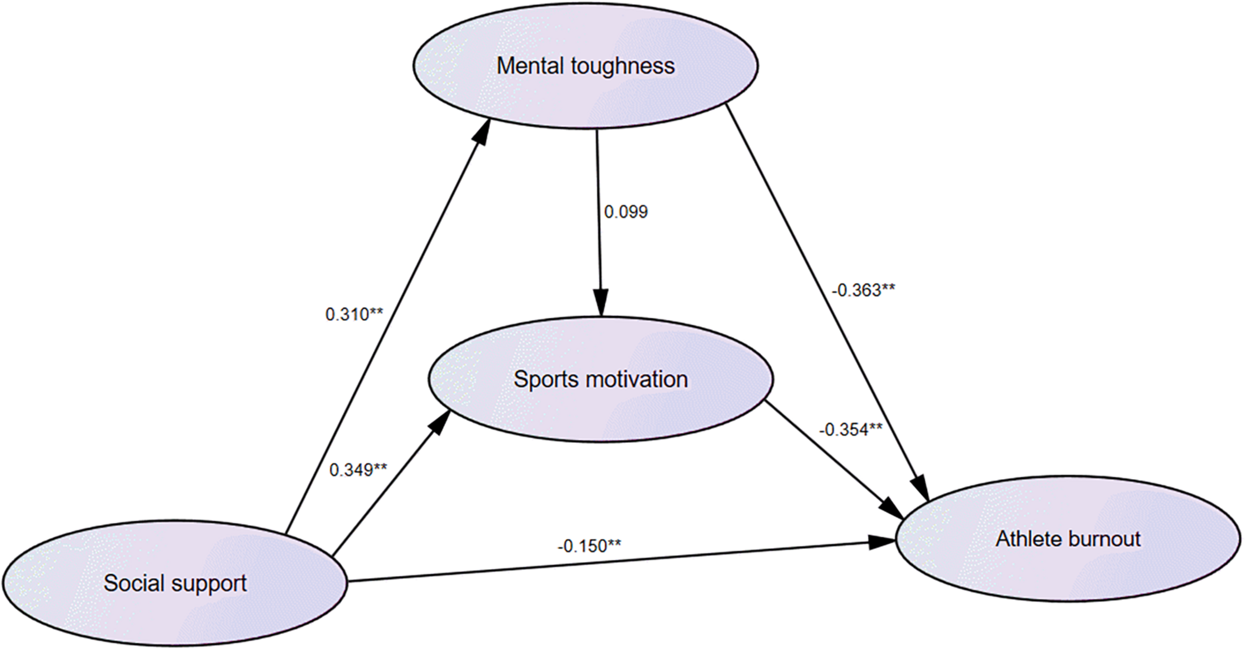 Conclusion: The findings revealed that social support could inhibit or prevent athlete burnout via mental toughness and sports motivation; thus, to decrease or relieve the prevalence of burnout in weightlifters, it is an important solution to enhance their social support.