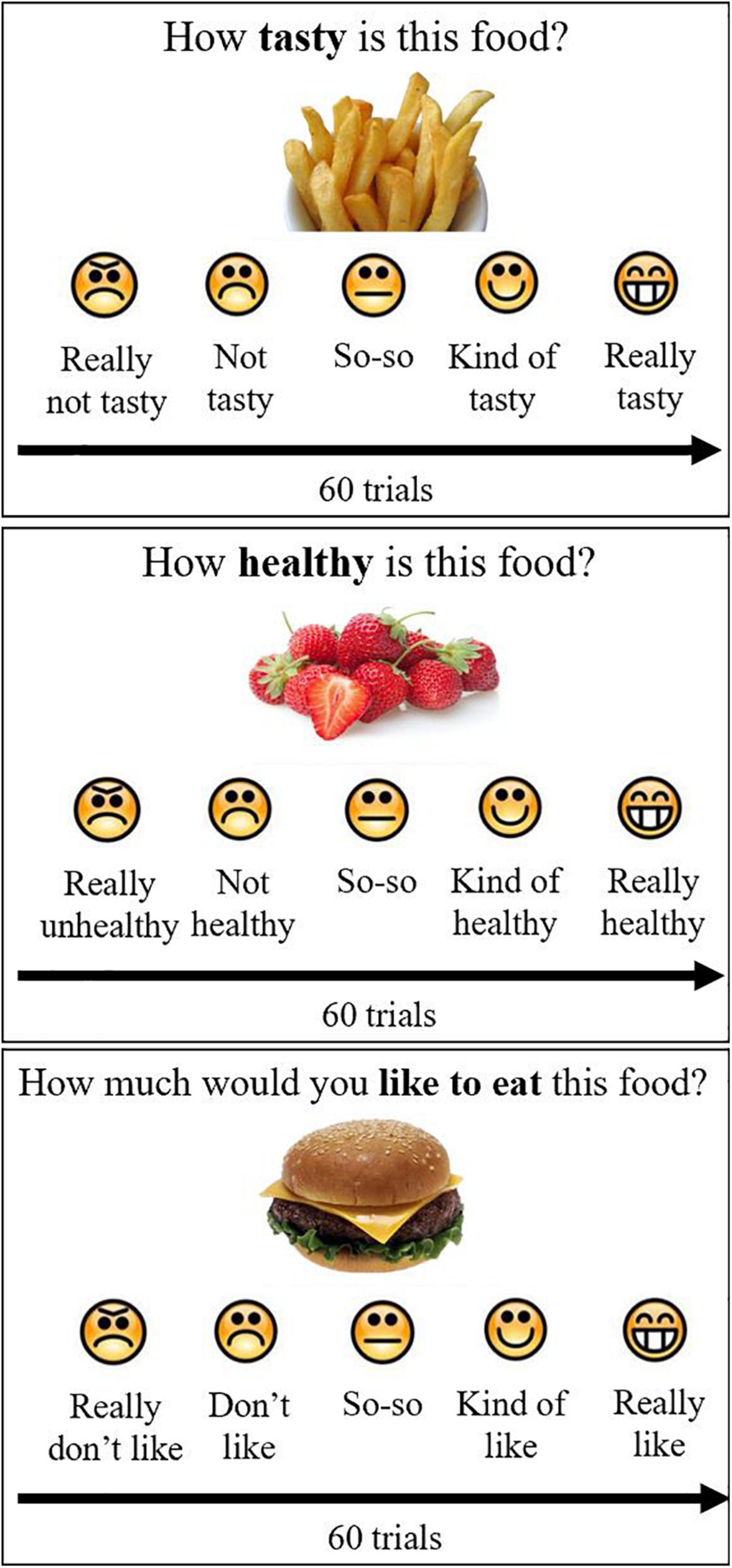 Food ratings. Participants rated 60 foods on taste, health and preference, using a 5-point scale with emoticons and words, by pushing buttons on the keyboard. Block and stimulus order were randomized across participants.