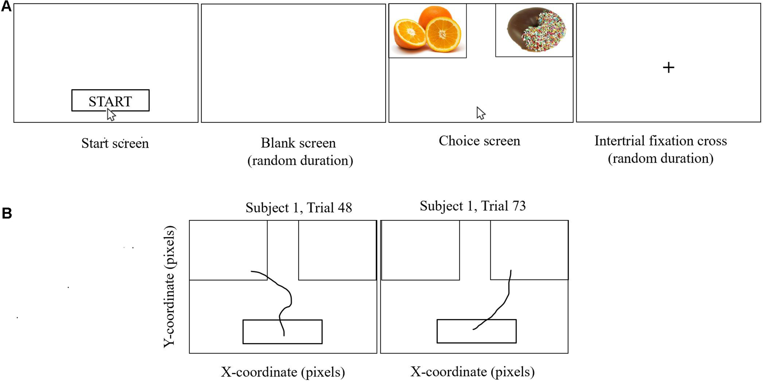 Food-choice mouse-tracking. Participants were asked to choose the food item they would like to eat. They completed several practice trials prior to starting the task. As shown in (A), participants clicked on the Start button, after which there was a blank screen of random duration (200–500 ms), and then the cursor would reappear in the bottom center of the screen and the food cues appeared on the screen, one at the left upper corner and one at the right upper corner of the screen. Participants moved the computer mouse to select a response and each mouse trajectory was recorded. Once the computer mouse entered the box containing the food cue, the trial ended, without the need to click. Trajectories were not visible to the participant. Trials were separated by a fixation cross of random duration (400–700 ms). One hundred binary choices were presented to each participant based on their individual ratings for taste and health from the food ratings task. Two representative mouse paths for Subject 1 are shown in (B) for trials on which the left-hand food item and the right-hand food item, respectively, were selected.