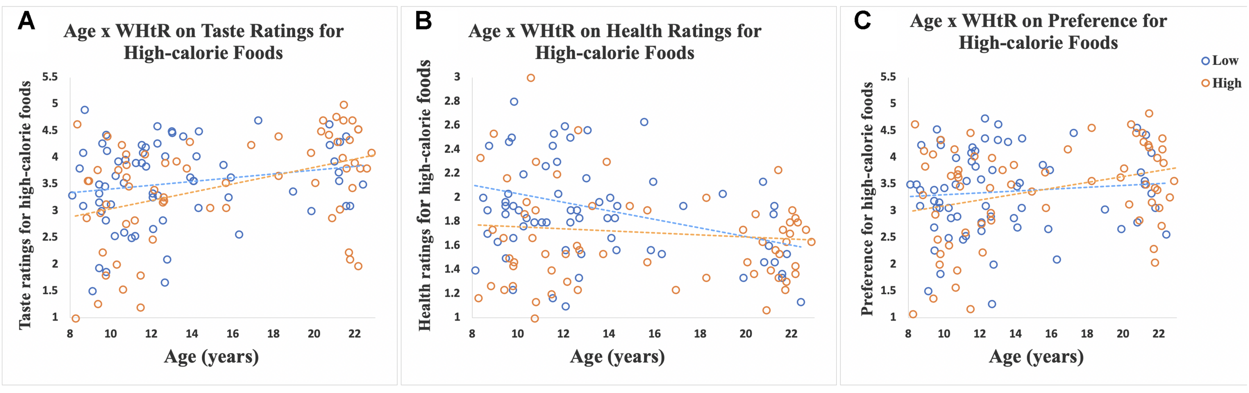 Our study adds to the current literature by assessing how taste and health attributes affect age-related changes in food preferences within an age-range that represents the most inclusive definition of adolescence based on neurodevelopment (Sawyer et al., 2018). With increasing age, there was a greater influence of taste attribute on food preference, suggesting that taste attribute contributes to increased preference for high-calorie foods with increasing age. These results are in line with prior studies showing that taste attribute was a stronger predictor of food preference in older vs. younger youth (van Meer et al., 2019; Pearce et al., 2020). We additionally showed an interaction of age and WHtR on β-taste, such that the group with high WHtR demonstrated a greater positive relationship between age and β-taste compared with the low WHtR group. It has been demonstrated that children with obesity, relative to children with healthy-weight, demonstrated greater responses to sweet taste (vs. water) in the insula and amygdala, regions implicated in taste processing and emotion signaling (Boutelle et al., 2015). These results suggested that youth with higher adiposity may have heightened sensitivity to appetitive taste. Our data further suggested that the association between taste and adiposity may be greater in older than younger youth. We additionally observed that older youth compared with younger ones reported higher taste ratings but lower health ratings for high-calorie foods. The former was driven by having a higher WHtR and the latter was driven by having a lower WHtR. Older youth with higher central adiposity may be most susceptible to excessive consumption of high-calorie foods that are highly palatable. It has been shown that health literacy increases with age, whereas nutritional awareness does not change as consistently with age (Naeeni et al., 2014); it has also been reported that health literacy is inversely associated with obesity in adolescents (Lam and Yang, 2014), which is consistent with our findings, with participants with low WHtR showing decreased health ratings for high-calorie foods as a function of age. This suggests it may be particularly beneficial to focus on health literacy and nutritional awareness in youth with higher abdominal obesity.