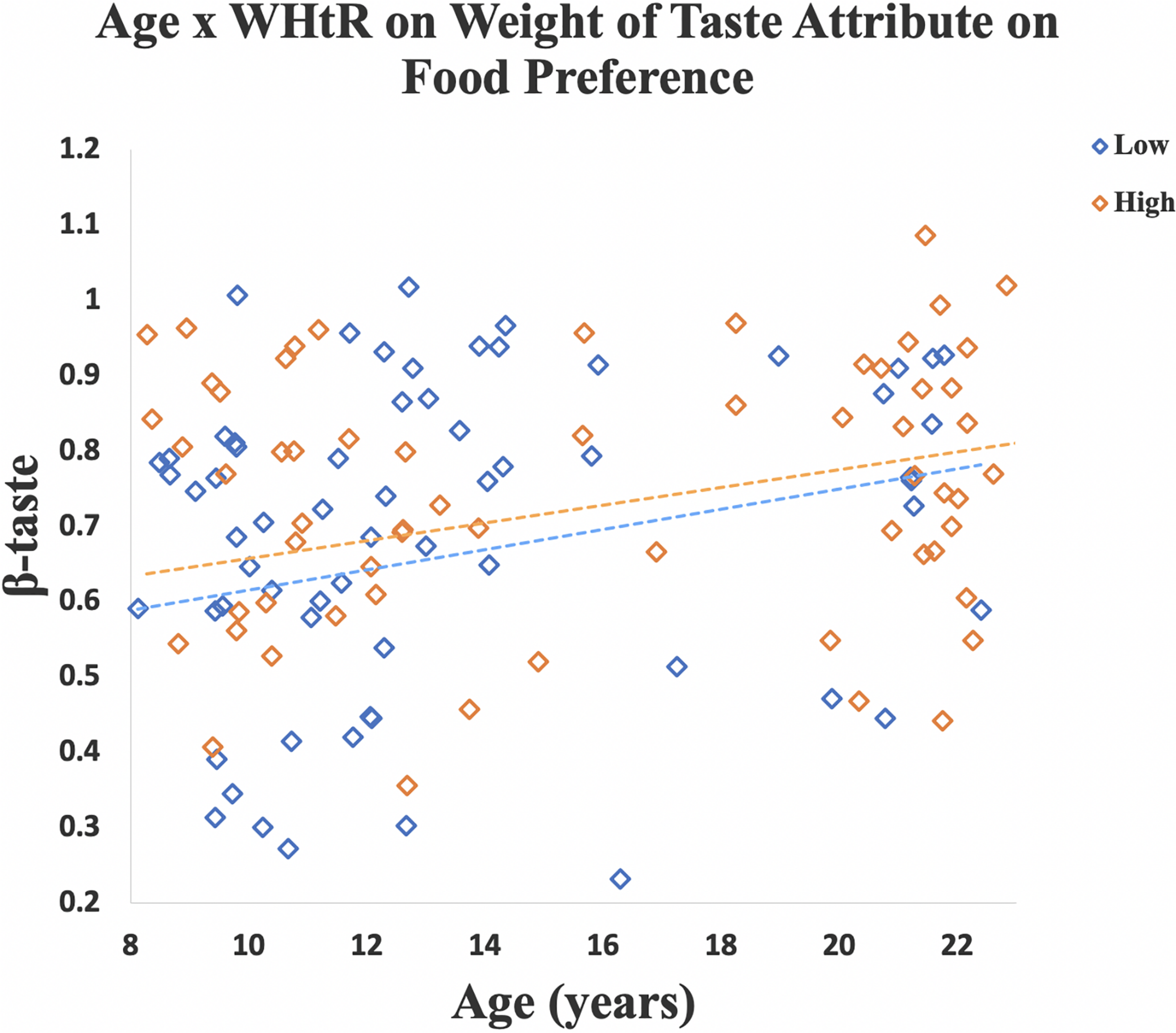 A linear regression model was created for each participant to measure how well the taste ratings predicted their preference for a specific food cue (i.e., β-weight). Scatterplot shows that older age was associated with a higher β-taste. Relationship between age and β-taste was significant in the high WHtR group, and marginally significant in the low WHtR group. Data for participants with low WHtR are shown in blue diamonds and those with high WHtR are shown in orange diamonds.
