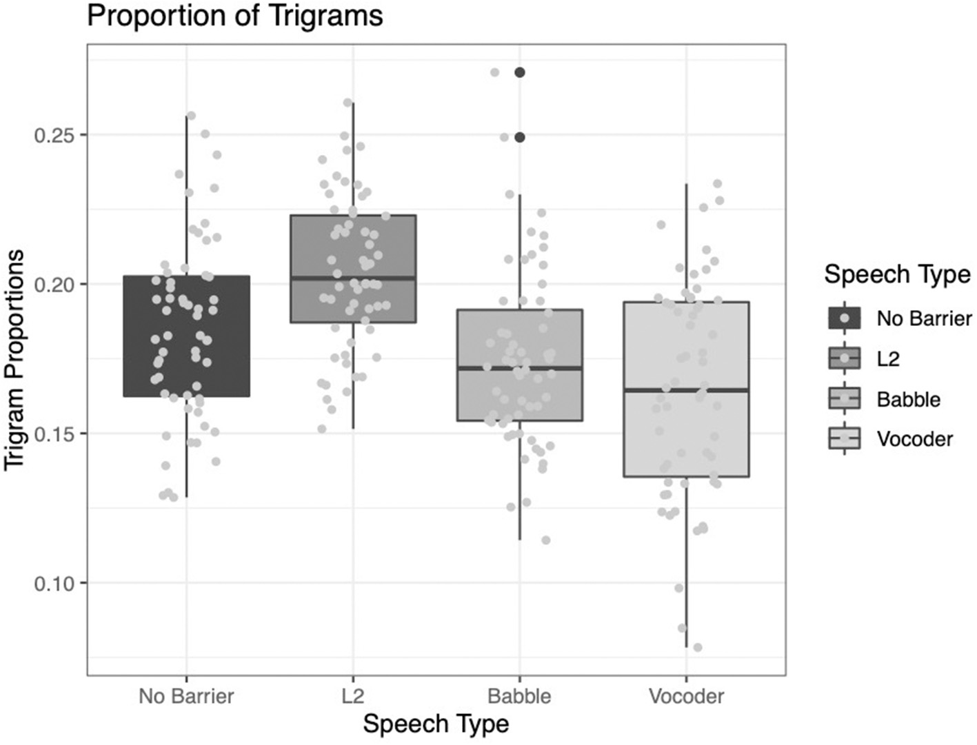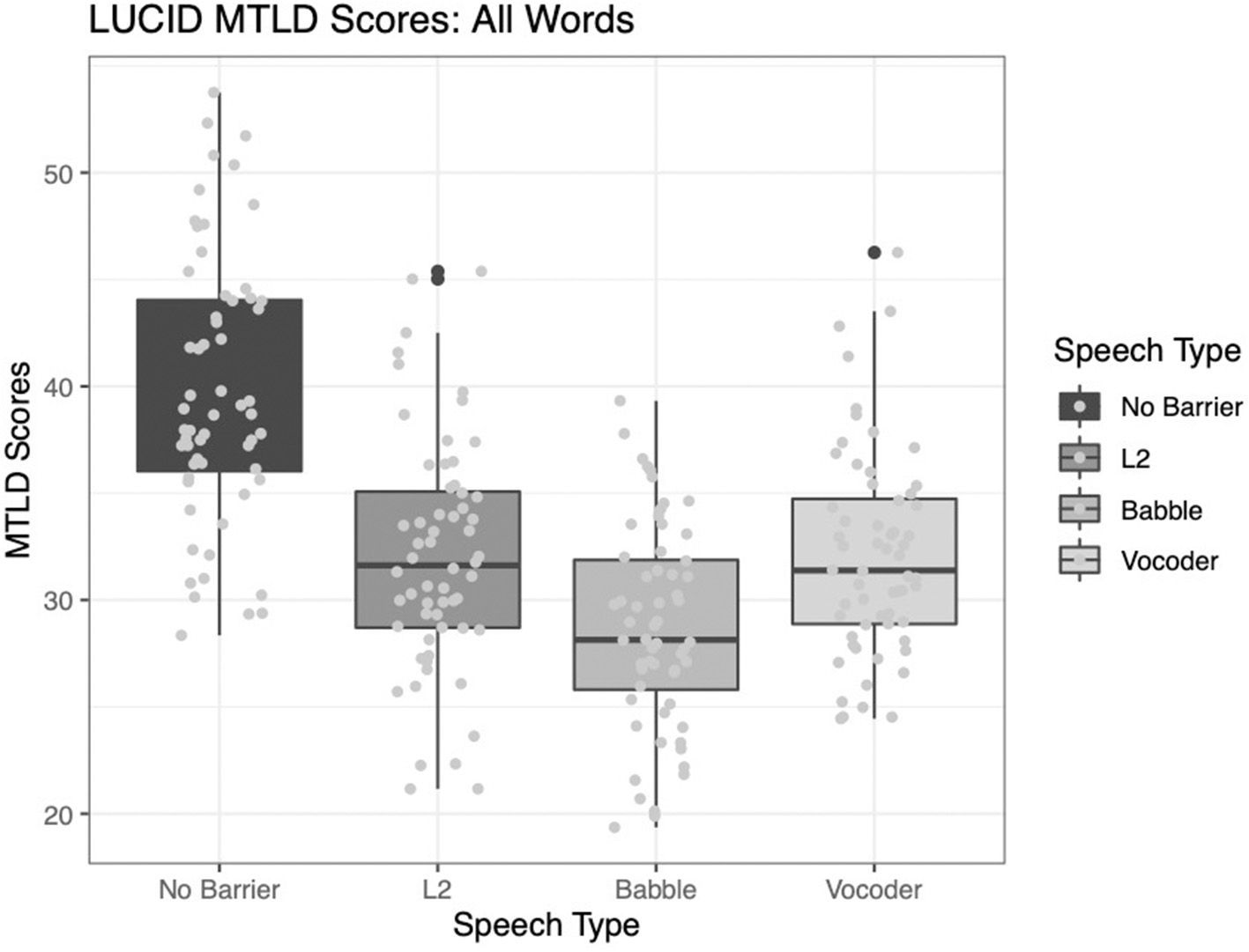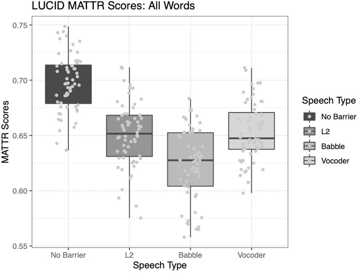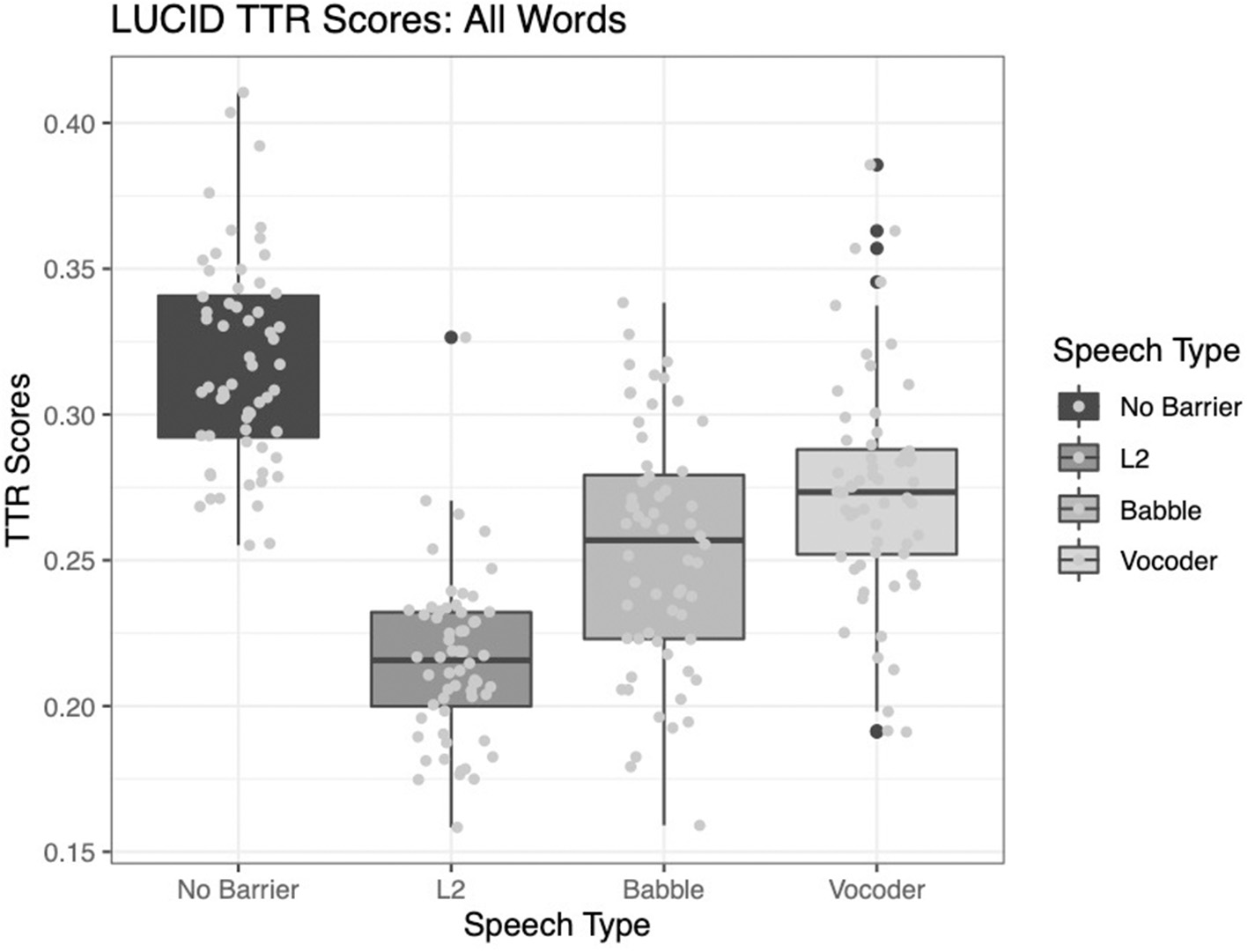 All three main effects were significant for the analysis of type-token ratio. The comparison of the no-barrier condition to the other three conditions significantly improved model fit (χ2 = 139.8, p < 0.0001). The comparison of the L2 condition to the other two barrier conditions (babble and vocoded) also significantly improved model fit (χ2 = 60.916, p < 0.0001). Finally, the comparison between the babble and vocoded conditions also significantly improved model fit (χ2 = 6.15, p = 0.013).